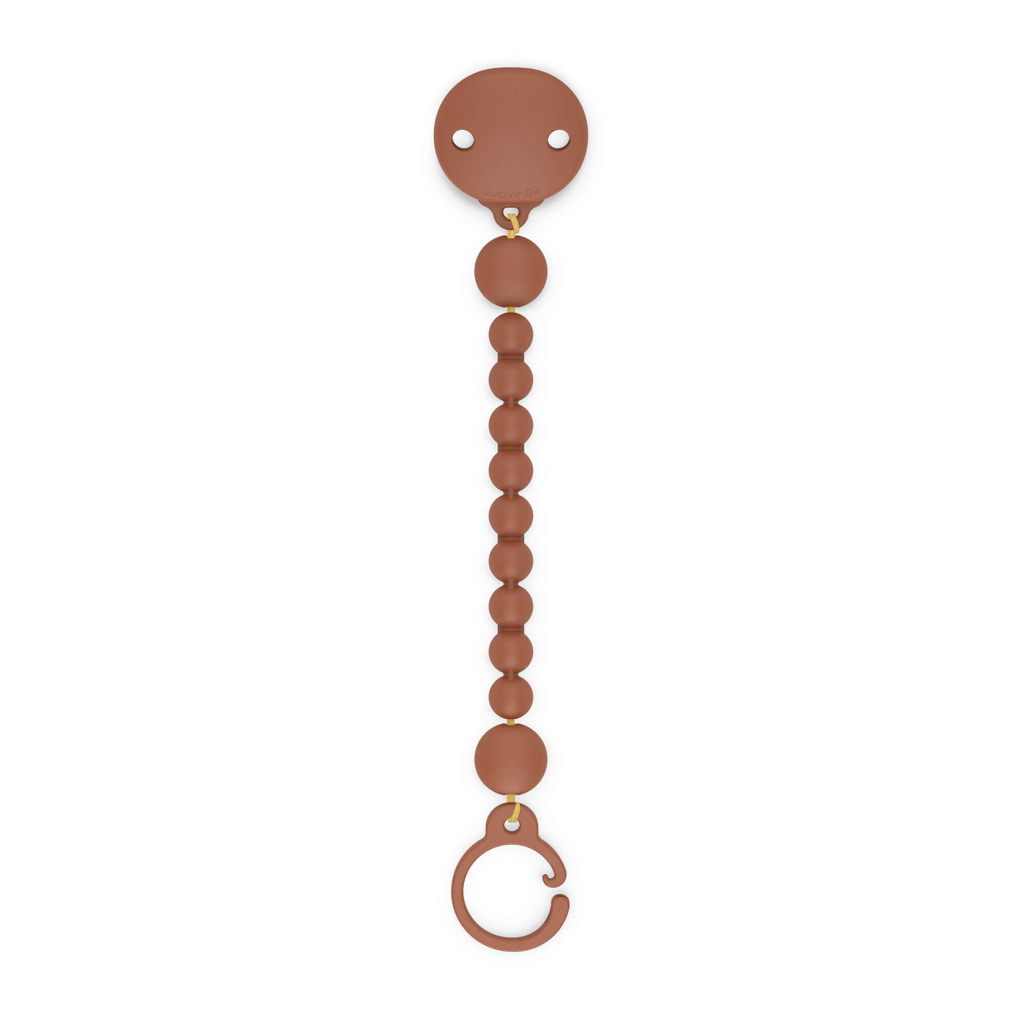 Clipe para chupeta Suavinex. Este clip permite prender as chupetas à roupa do bebé, evitando assim que caiam no chão, se sujem ou se percam.O clipe do broche, que se prende à roupa, tem um anel onde se insere a chupeta para bebés a partir dos 0 meses. Corrente de silicone macia e flexível para chupetas, numa única peça de silicone para maior segurança.