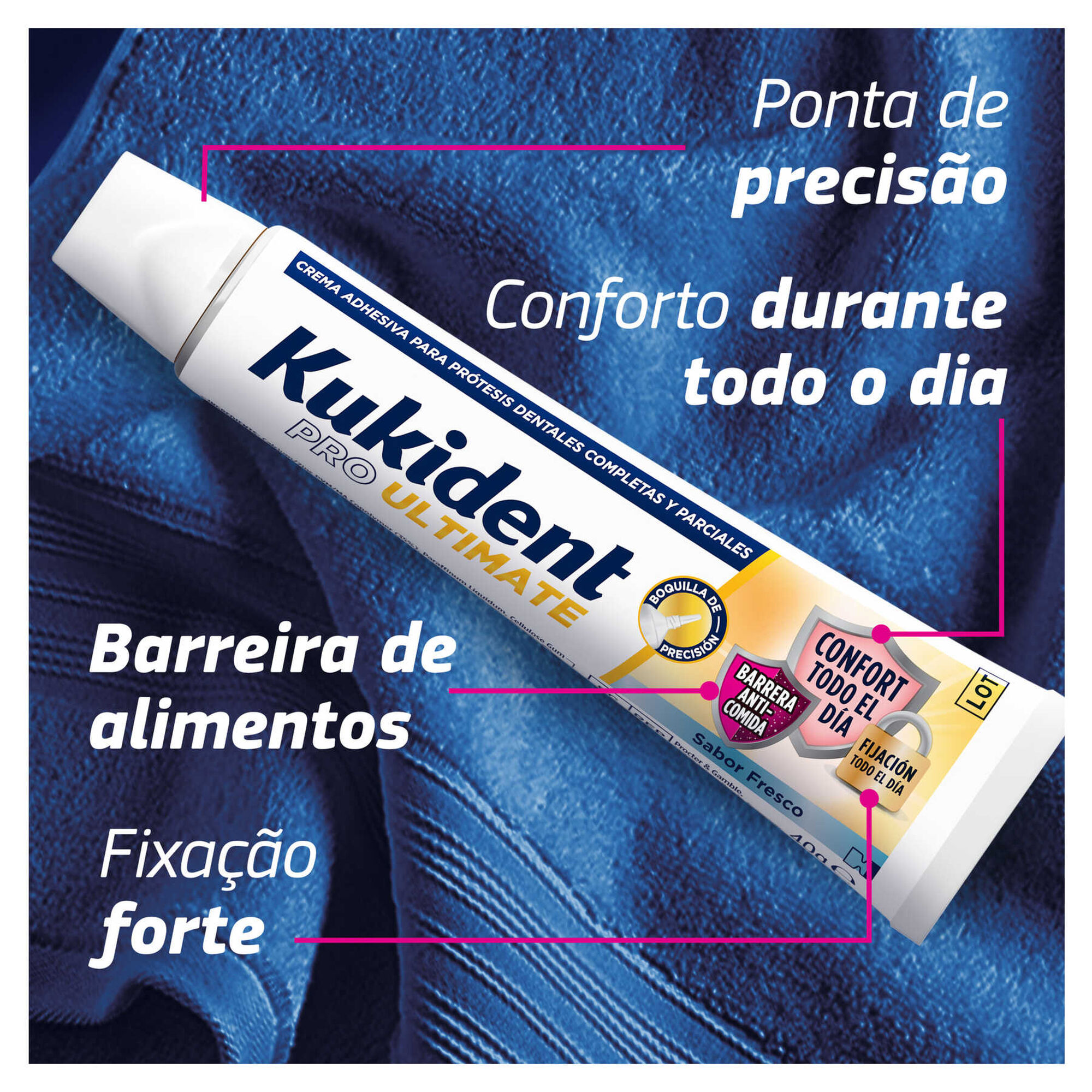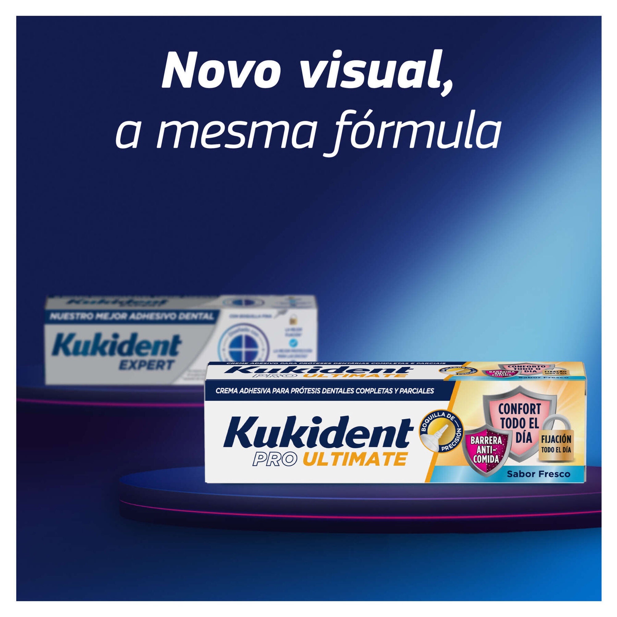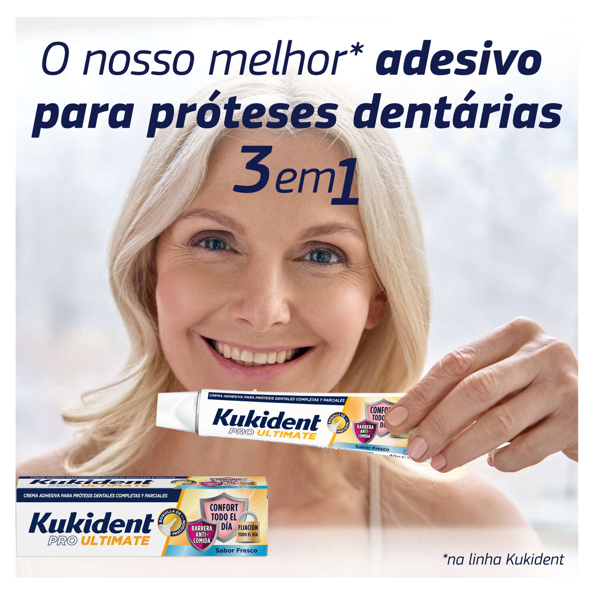 A melhor fixação, proteção das gengivas e hálito fresco da linha Kukident. Com ligeiro sabor a menta e um bocal superfino que permite uma aplicação exata. Dispositivo Médico.