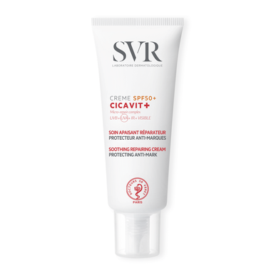 O Creme Cicatrizante Rosto Corpo SPF50+ Cicavit é reparador para a pele lesada e fragilizada exposta ao sol.