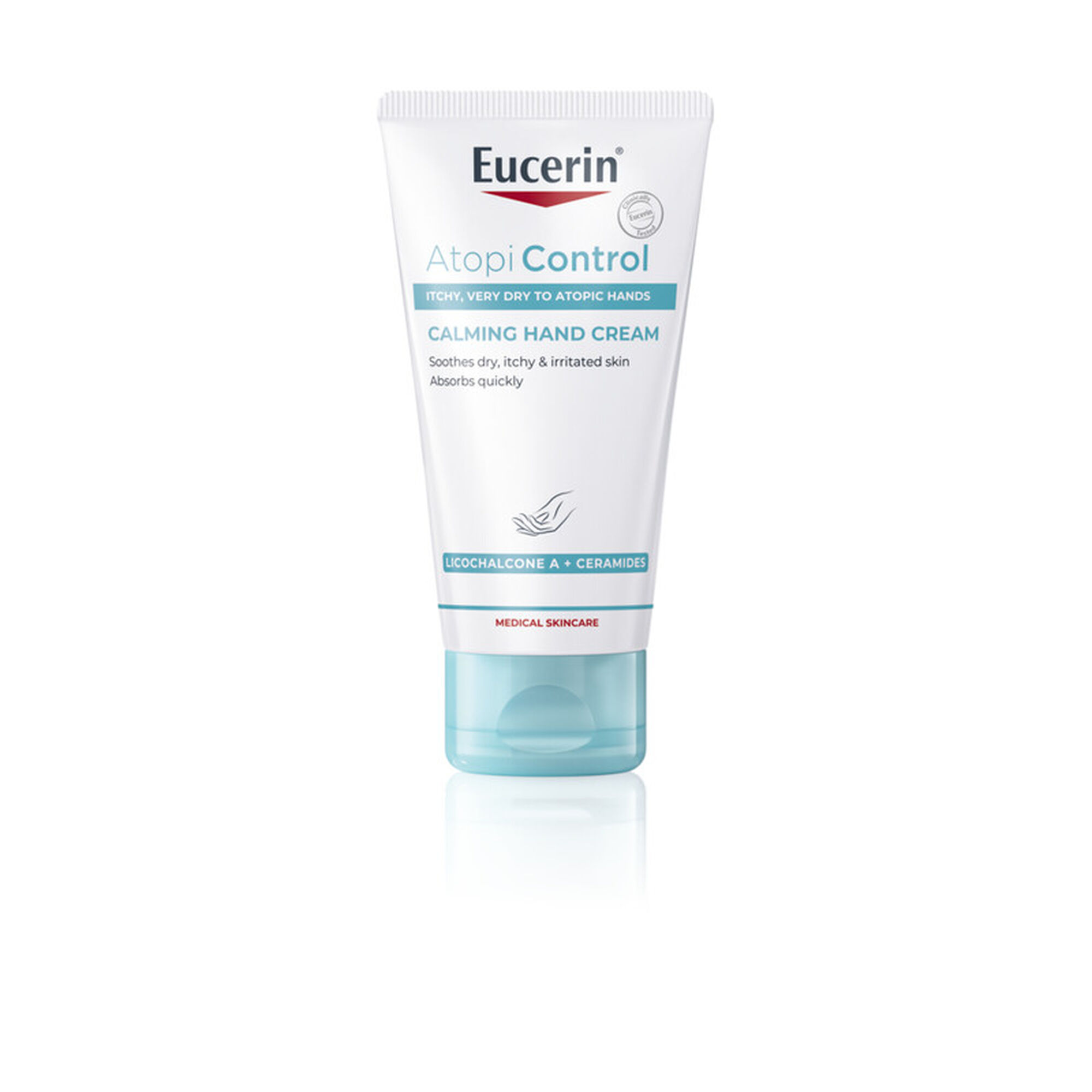 Eucerin AtopiControl Creme de Mãos reduz a secura e a irritação da pele, mesmo com a lavagem frequente. Adequado para o cuidado complementar em casos de eczema ou pele atópica. Fórmula não gordurosa, de rápida absorção e adequada a bebés.