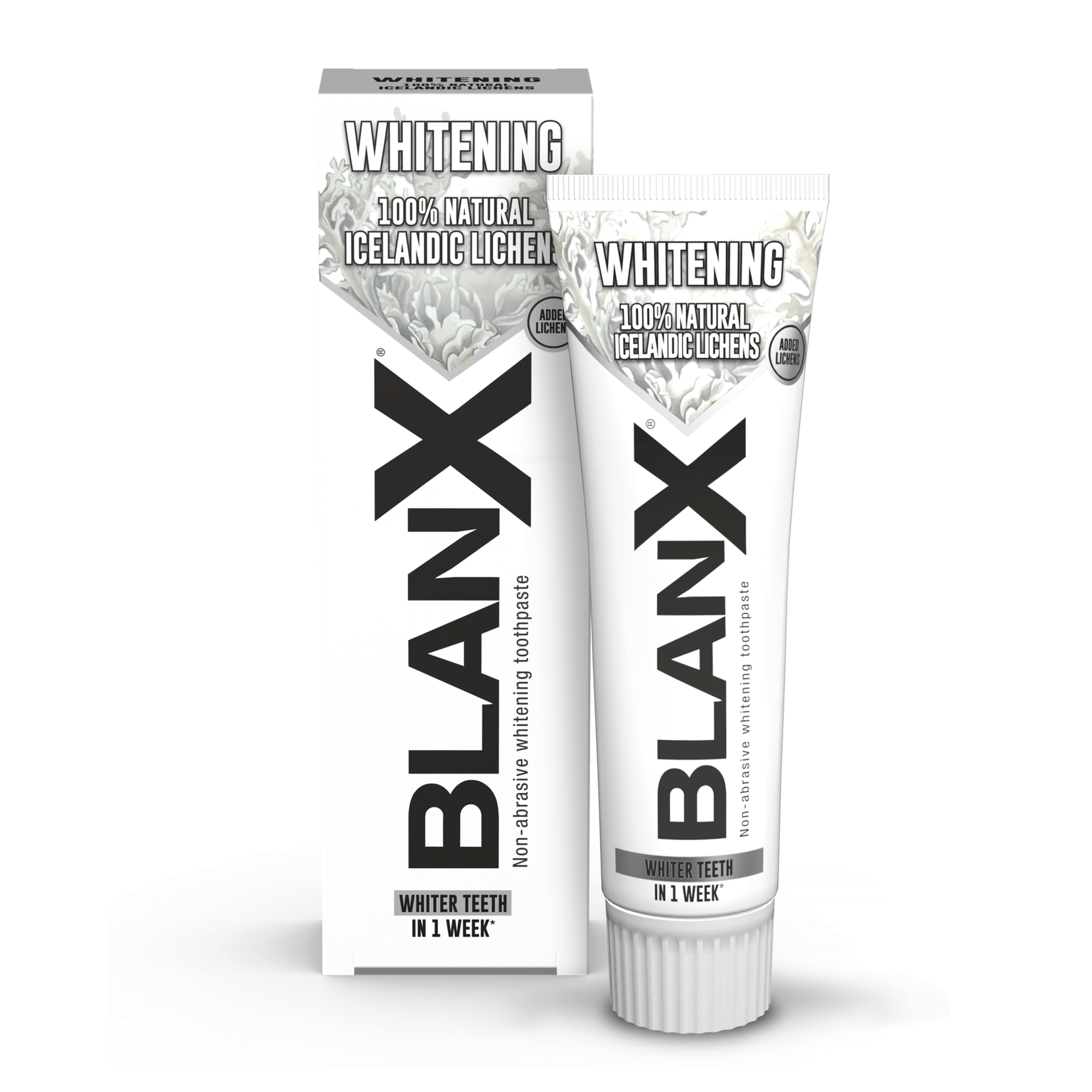 Dentífrico Branqueador Natural Líquenes do Ártico. 100% liquenes da Islândia e a silica suave de BlanX para branqueamento suave. Proteção antiplaca bacteriana. Com flúor.