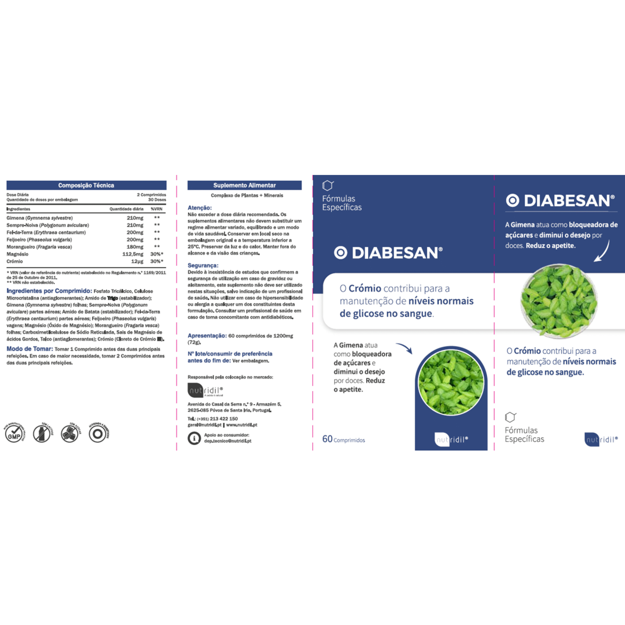 Ingredientes por 2 Comprimidos: Fosfato tricálcico, celulose microcristalina (antiaglomerantes); amido de trigo (estabilizador); Gimena (Gymnema sylvestre) folhas 210mg; Sempre-Noiva (Polygonum aviculare) partes aéreas 210mg; amido de batata (estabilizador); Fel-da-Terra (Erythraea centaurium) partes aéreas 200mg; Feijoeiro (Phaseolus vulgaris) vagens 200mg; Magnésio (Óxido de Magnésio) 112,5mg (30% VRN*); Morangueiro (Fragaria vesca) folhas 180mg; carboximetilcelulose de sódio reticulada, sais de magnésio de ácidos gordos e talco (antiaglomerantes); Crómio (Cloreto de Crómio III) 12μg (30% VRN*).