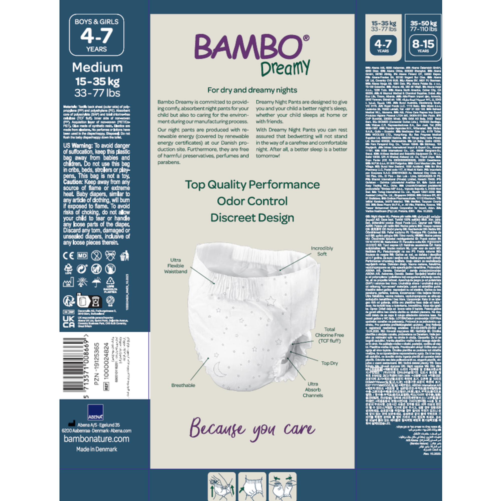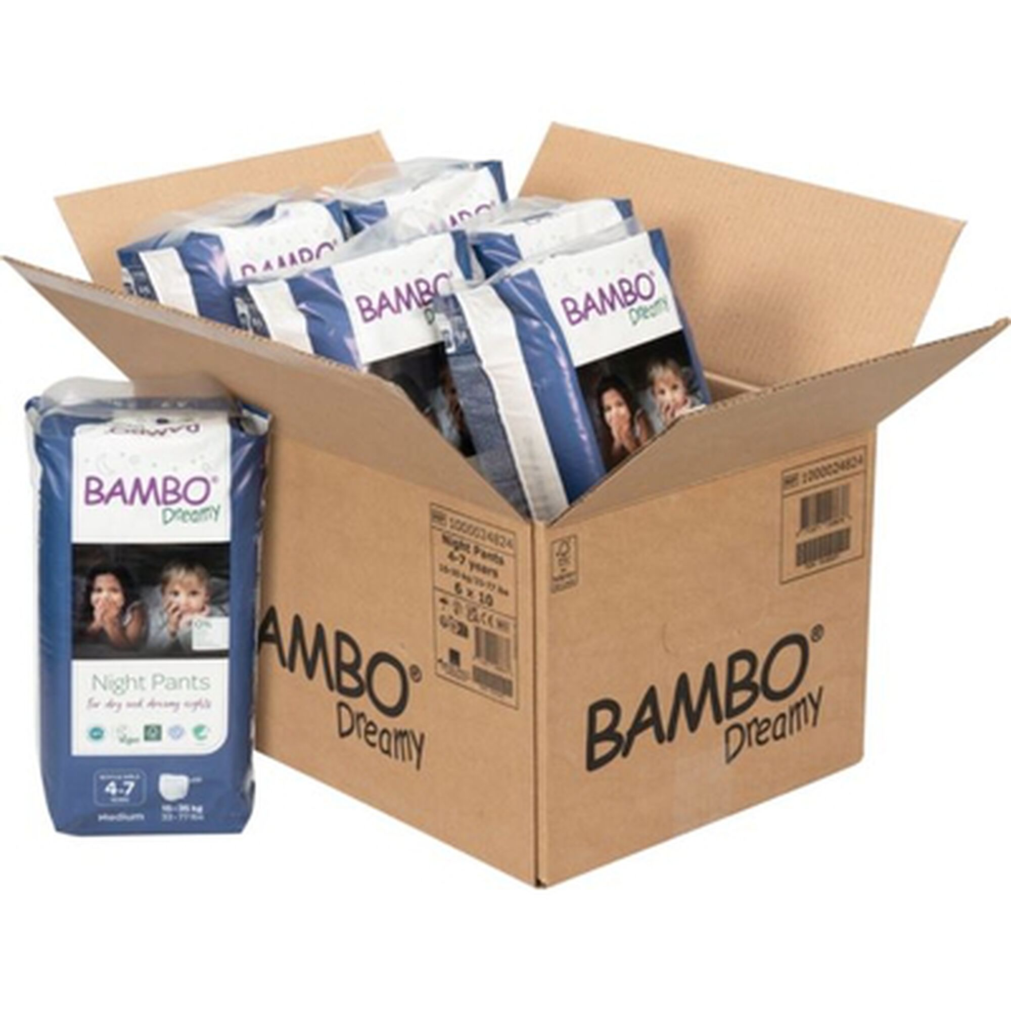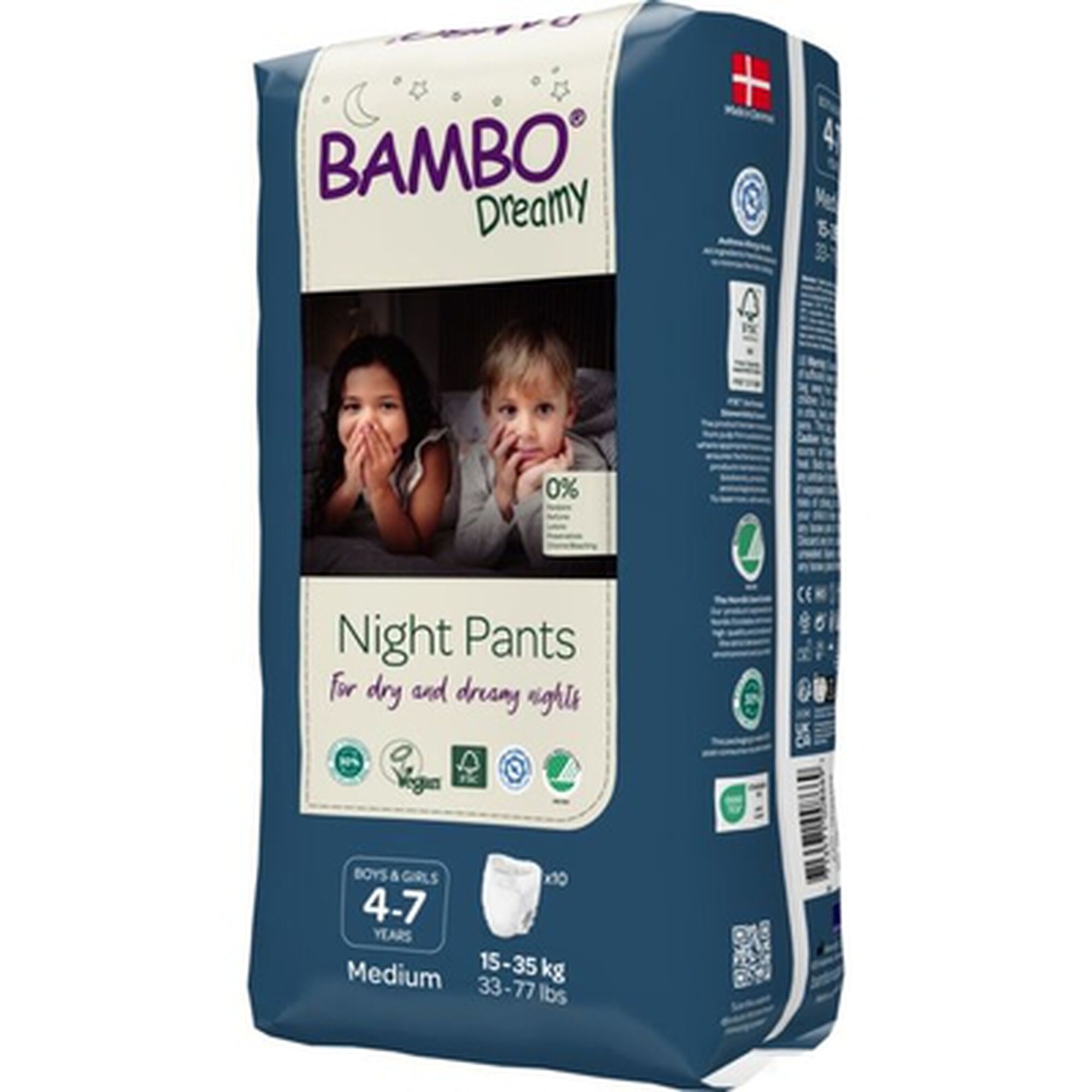 As fraldas-cueca noturnas Bambo Dreamy M são adequadas para bebés dos 15kg aos 35kg.