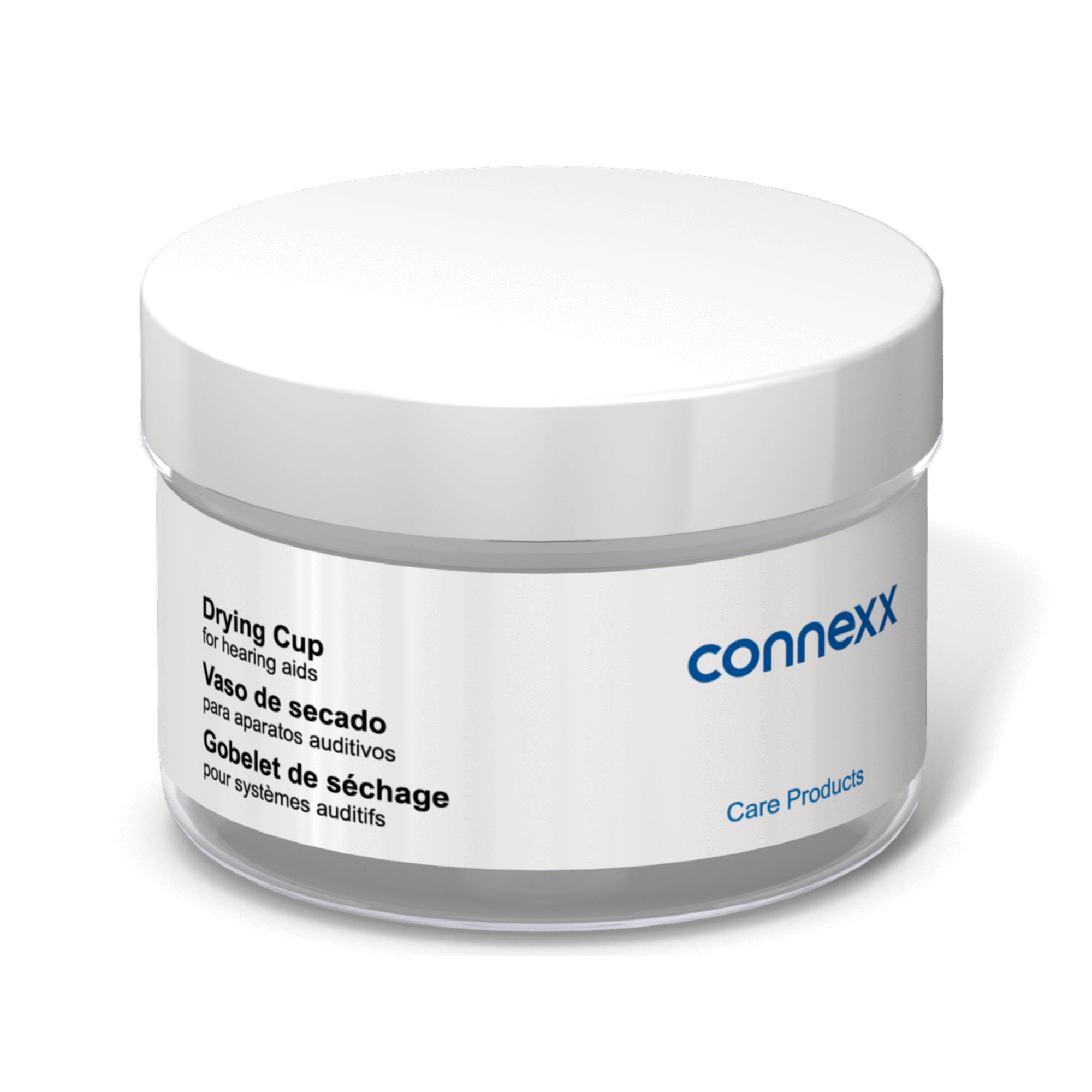 O Copo de secagem da Connexx é usado para secar os aparelhos auditivos em combinação com uma pastilha desumidificadora.