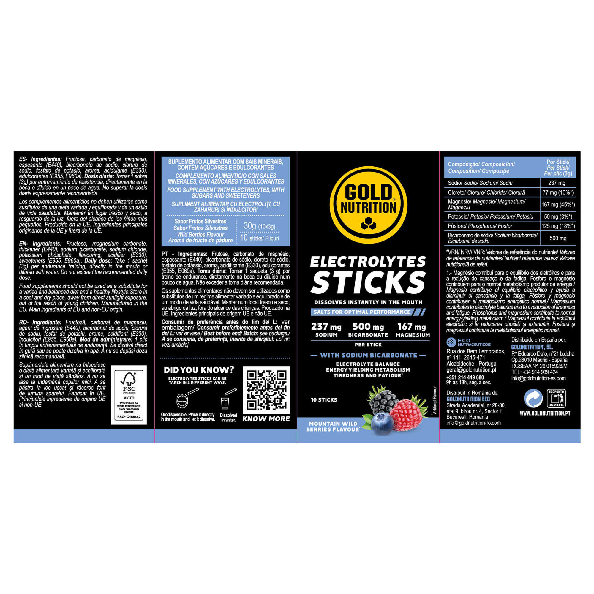 Electrolytes Sticks GoldNutrition® é uma fórmula desenvolvida para complementar as bebidas isotónicas de maneira a garantir a reposição adequada dos electrólitos perdidos, sendo também uma alternativa para aqueles que desejam repor eletrólitos sem consumir hidratos de carbono em simultâneo.