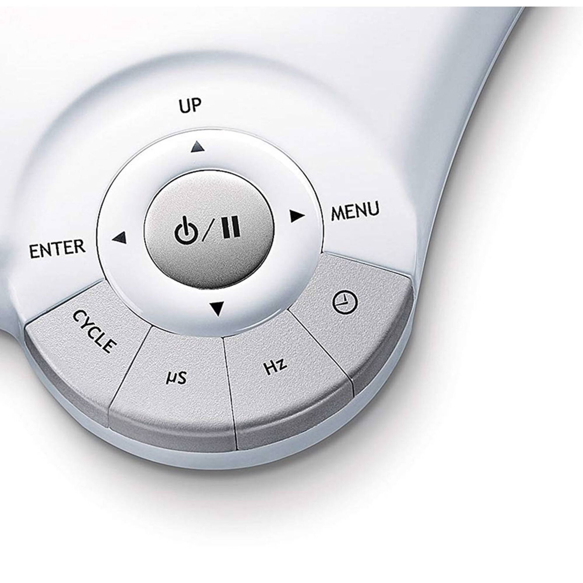 O eletroestimulador digital Beurer de design ergonómico, com um ecrã retroiluminado fácil de usar, possui 4 canais separados e ajustáveis com 8 eletrodos auto-adesivos. Incorpora 30 aplicações pré-programadas (TENS/EMS/Massage) e 20 programas livres e programáveis (em frequência, largura de pulso, tempo e fora de tempo). O tempo de treino é ajustável e possui uma função de segurança para desligar. Também tem a "função de médico" com a qual os programas pessoais podem ser preparados. Estojo e pilhas 3xAAA incluídas.