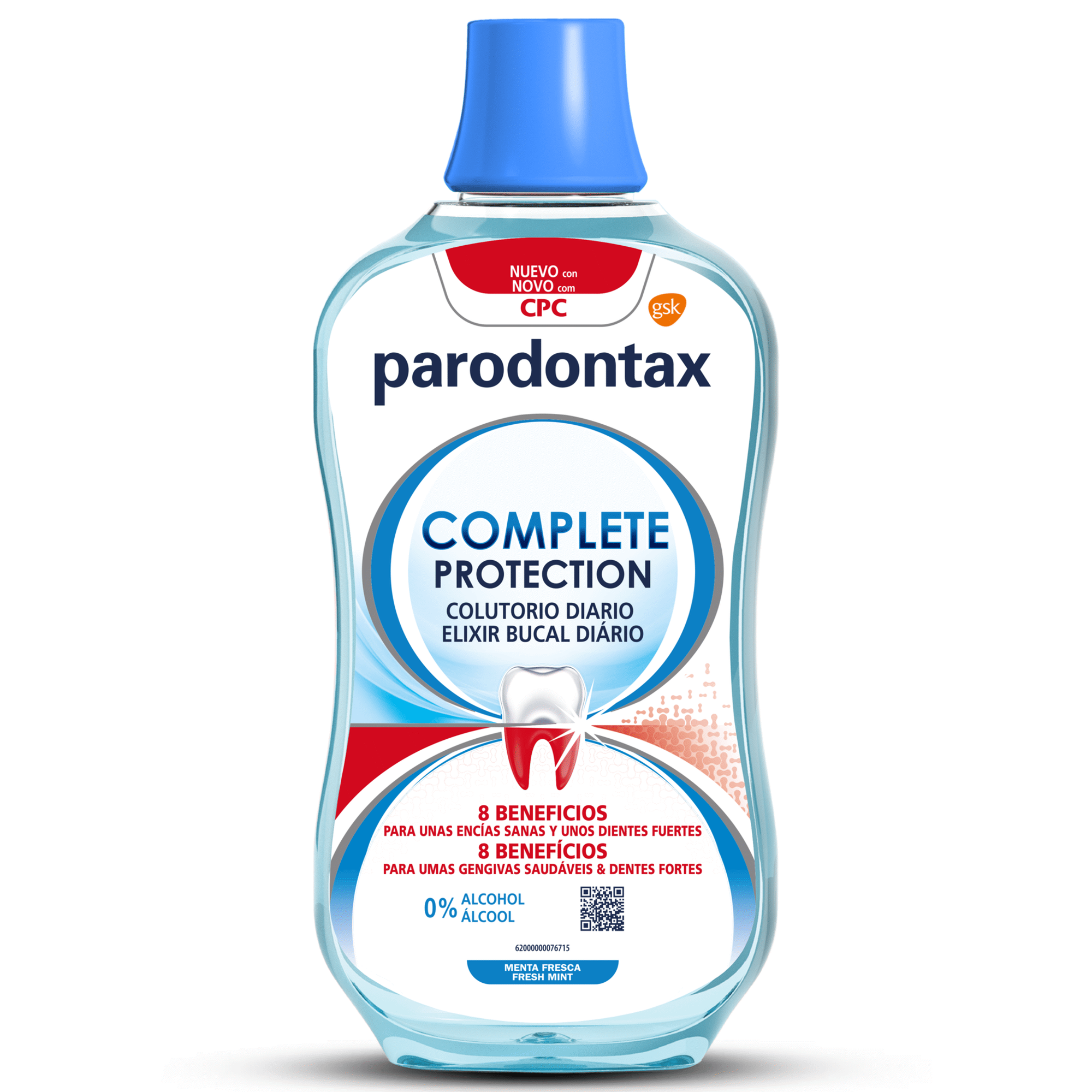 O Elixir Bucal Diário Parodontax Complete Protection, com tecnologia CPC, tem 8 benefícios que proporcionam uma proteção completa para gengivas saudáveis e dentes fortes*. Tem o sabor de menta fresca e não contém álcool.