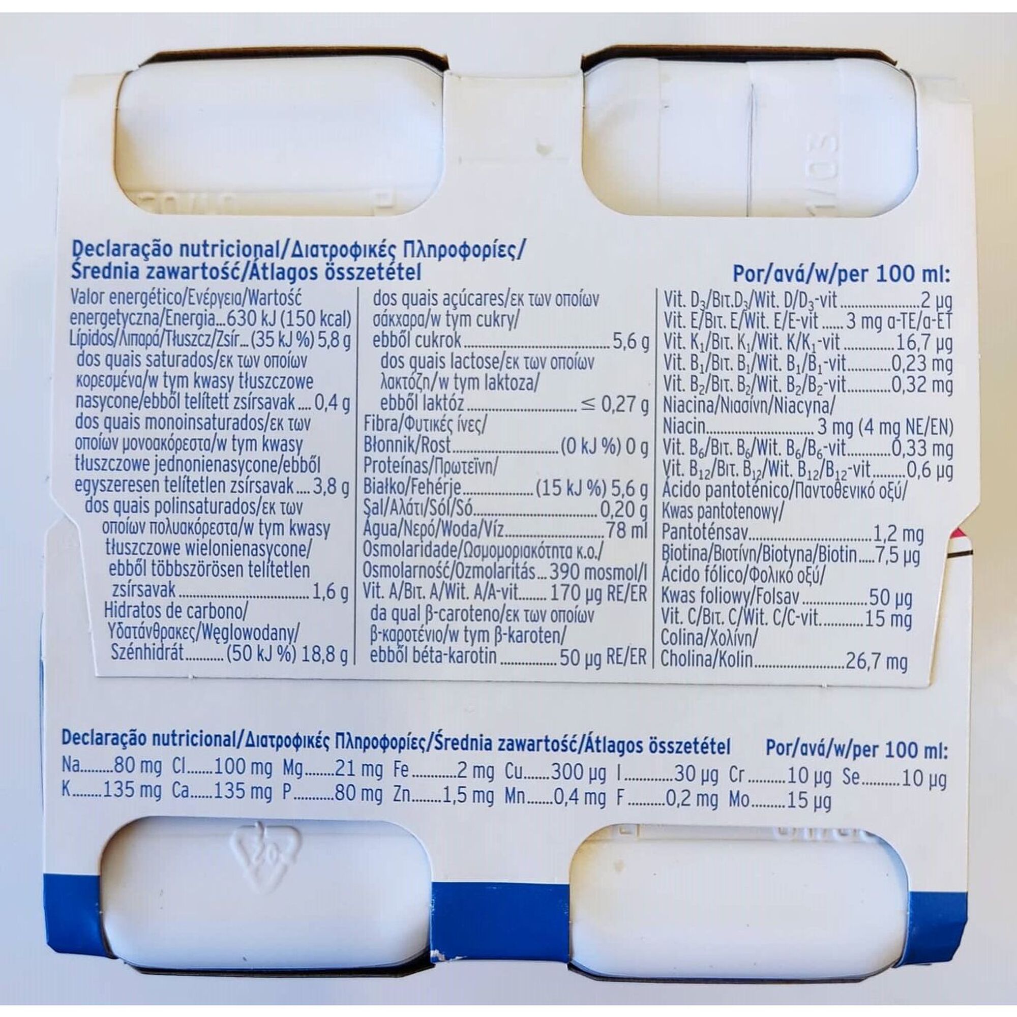 Suplemento nutricional oral completo, hipercalórico (1,5 kcal/ml). Clinicamente isento de lactose. Isento de glúten, de fibra e resíduos.