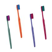 Uma escova de dentes suave com cerdas de 0,15 mm em nylon de alta qualidade, finamente arredondadas, para o cuidado oral diário dos dentes e o cuidado delicado das gengivas.