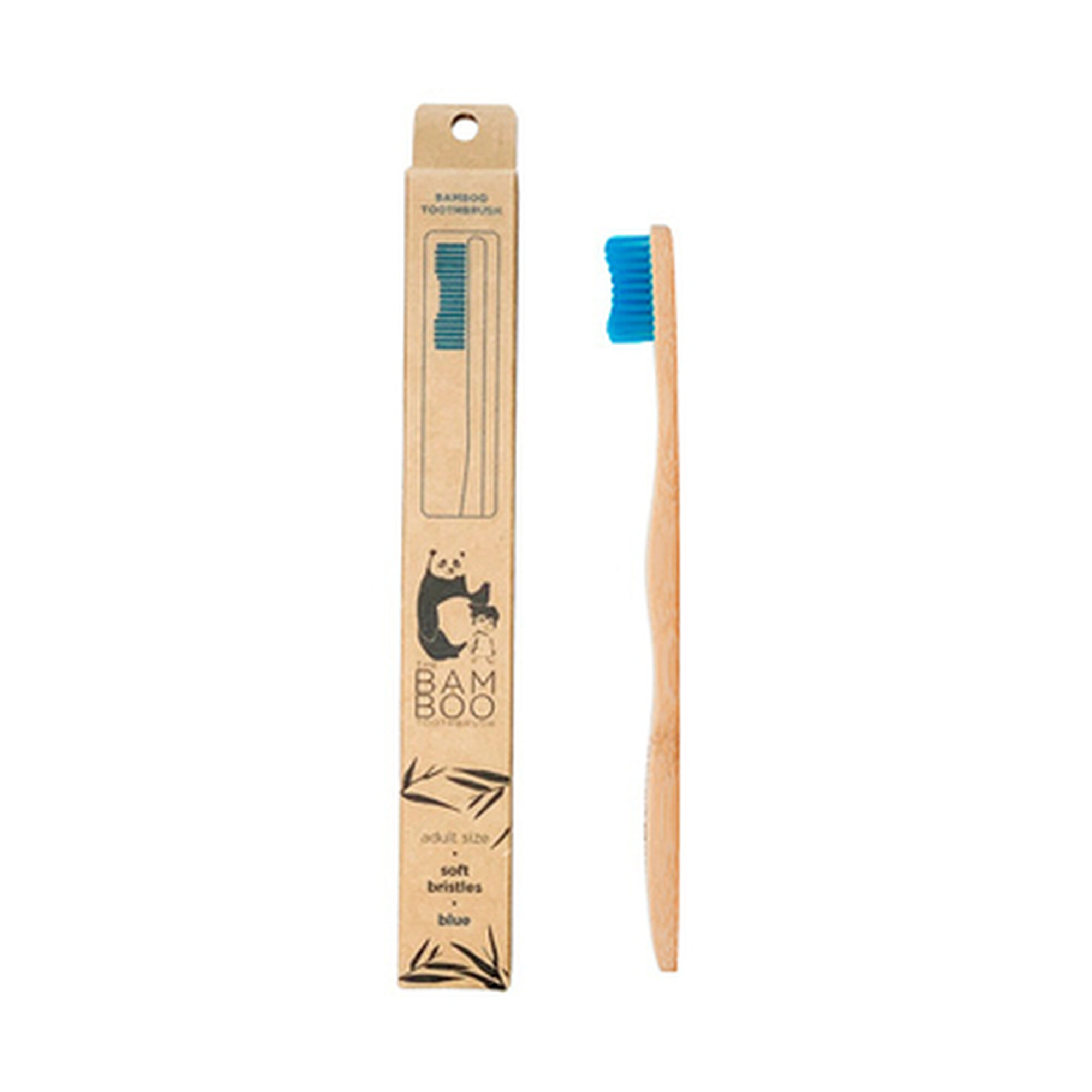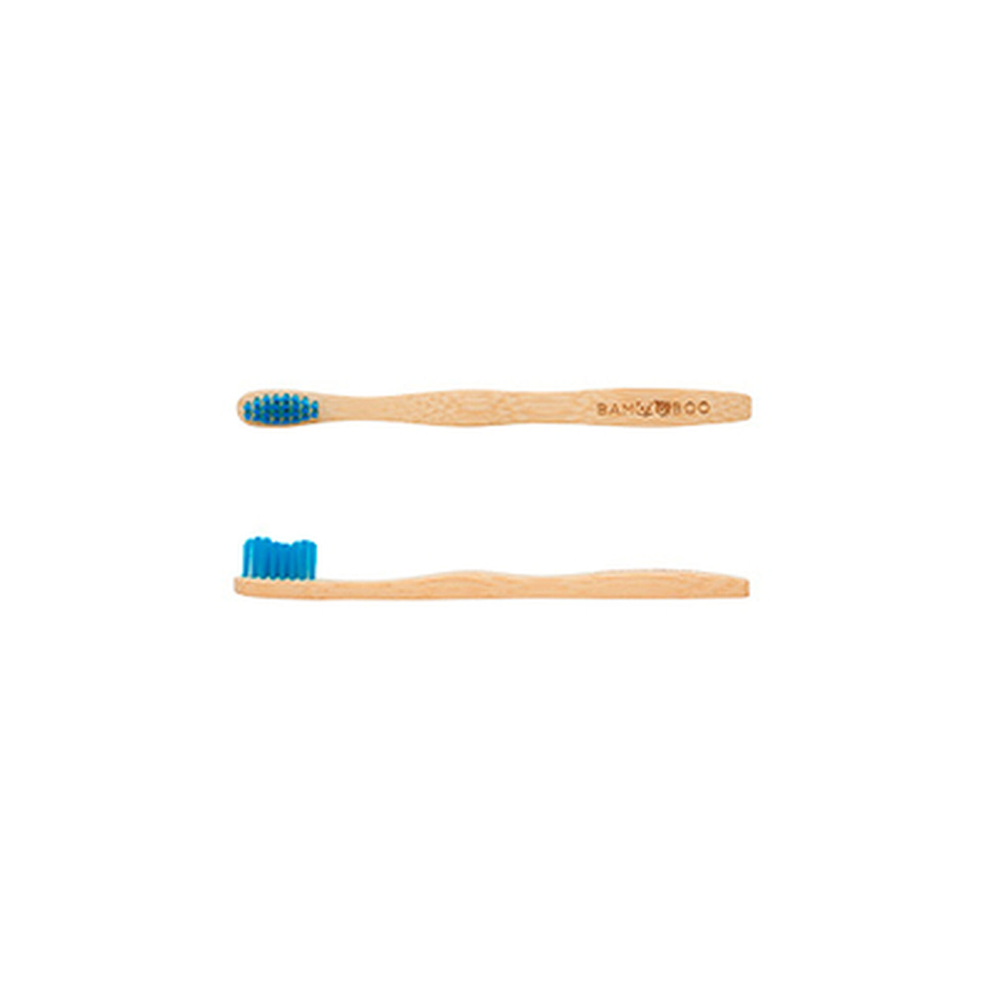 Escovas de dentes azul para crianças, com cabo em bambu e cerdas macias em nylon 6 sem bpa e em formato ondulado.