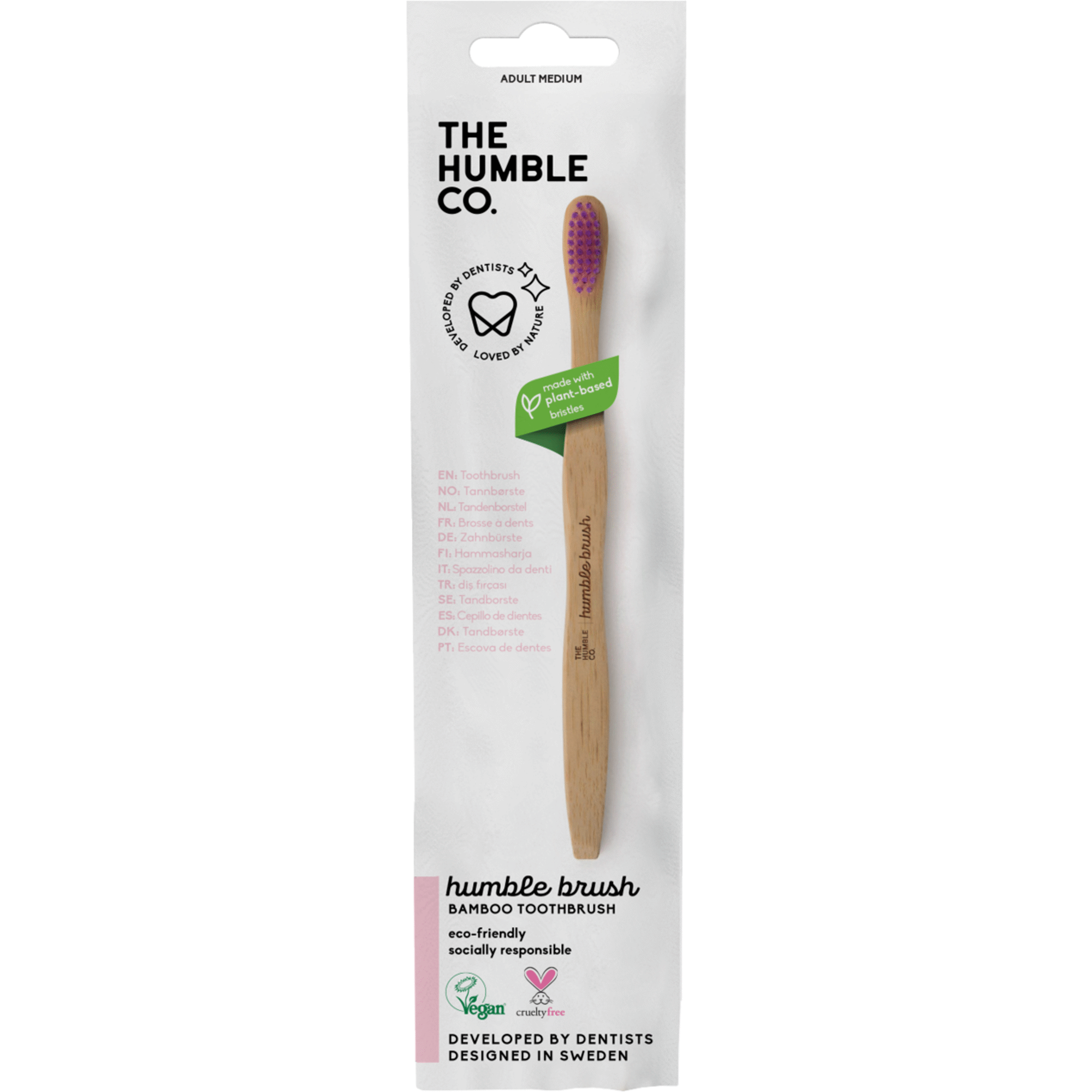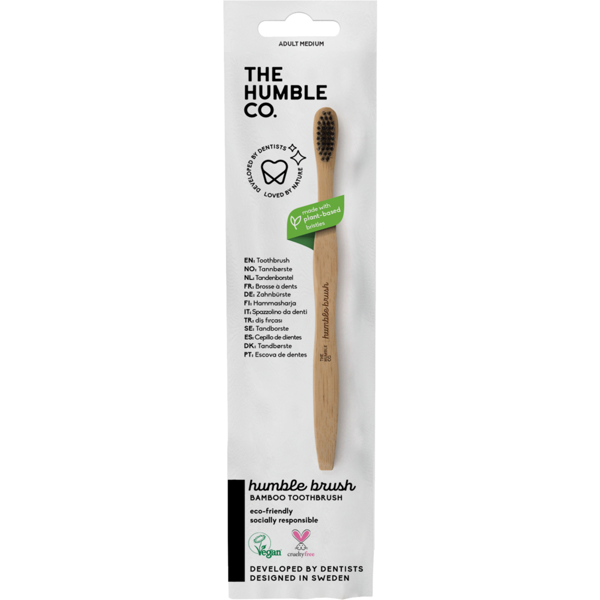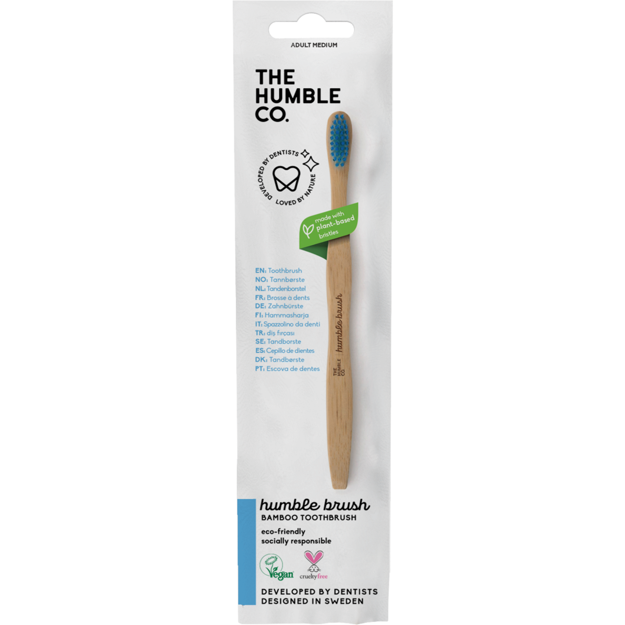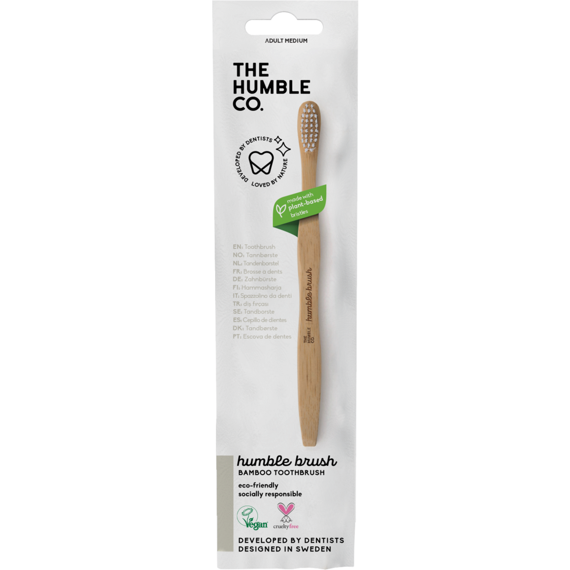 Escova de dentes desenvolvida por dentistas com cabo plano de bambu 100% biodegradável e cultivado de forma sustentável. Durabilidade idêntica à de uma escova convencional. Certificação Vegan. Cerdas médias. A The Humble Co. é não só ambientalmente como também socialmente responsável. Certificação Vegan. Mantenha a sua escova de dentes Humble Brush seca entre utilizações.