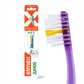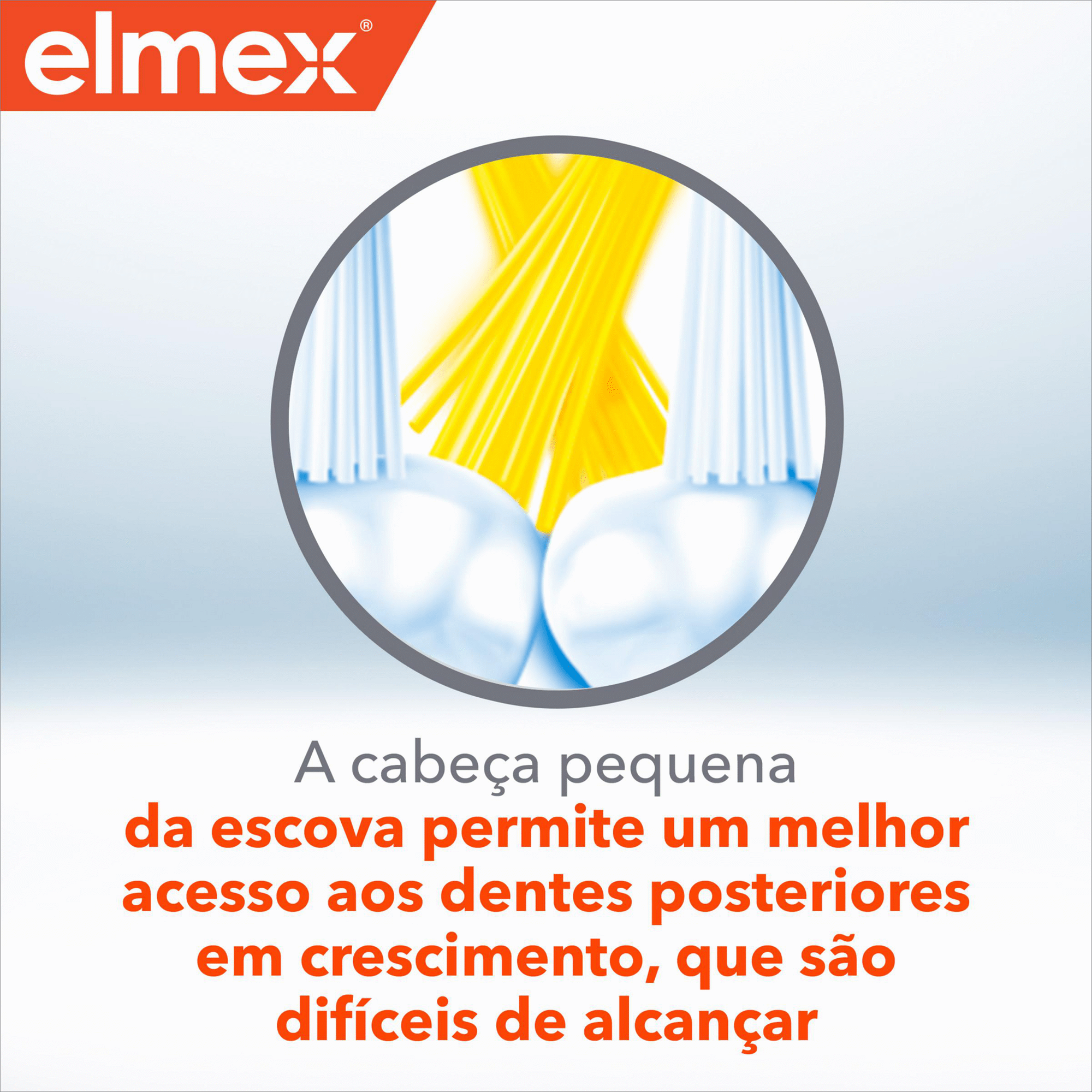 A escova de dentes elmex® JÚNIOR foi desenvolvida para facilitar a escovagem na fase em que os dentes de leite estão a ser substituídos pelos definitivos.