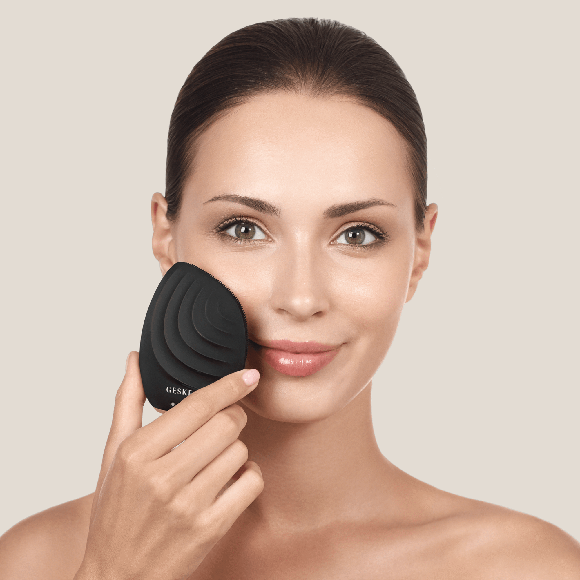 Presta atenção na linha do cabelo para limpares completamente qualquer sujidade e suor presos lá. Enxagua o rosto e a escova com água para remover qualquer resíduo de produto e seca o rosto. Limpa o dispositivo com um produto de limpeza de dispositivo GESKE após cada utilização.