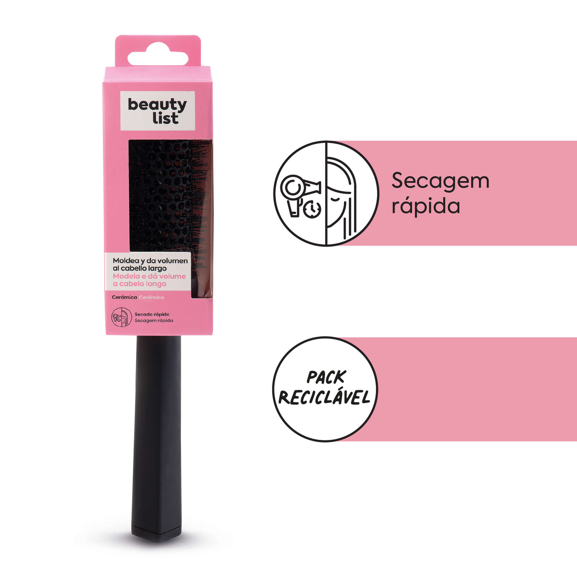 Indicado para secar e dar forma ao seu cabelo. Resultado profissional graças à sua estrutura de cerâmica que distribui o calor uniforme e elimina a electricidade estática. Utilizar a escova com maior diâmetro para um acabamento mais solto ou liso.