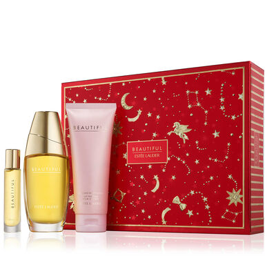 Coffret de edição limitada composto por: Beautiful Eau de Parfum Spray 75 ml + Beautiful Eau de Parfum 10 ml + Loção de Corpo Beautiful 100 ml.