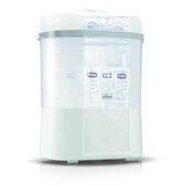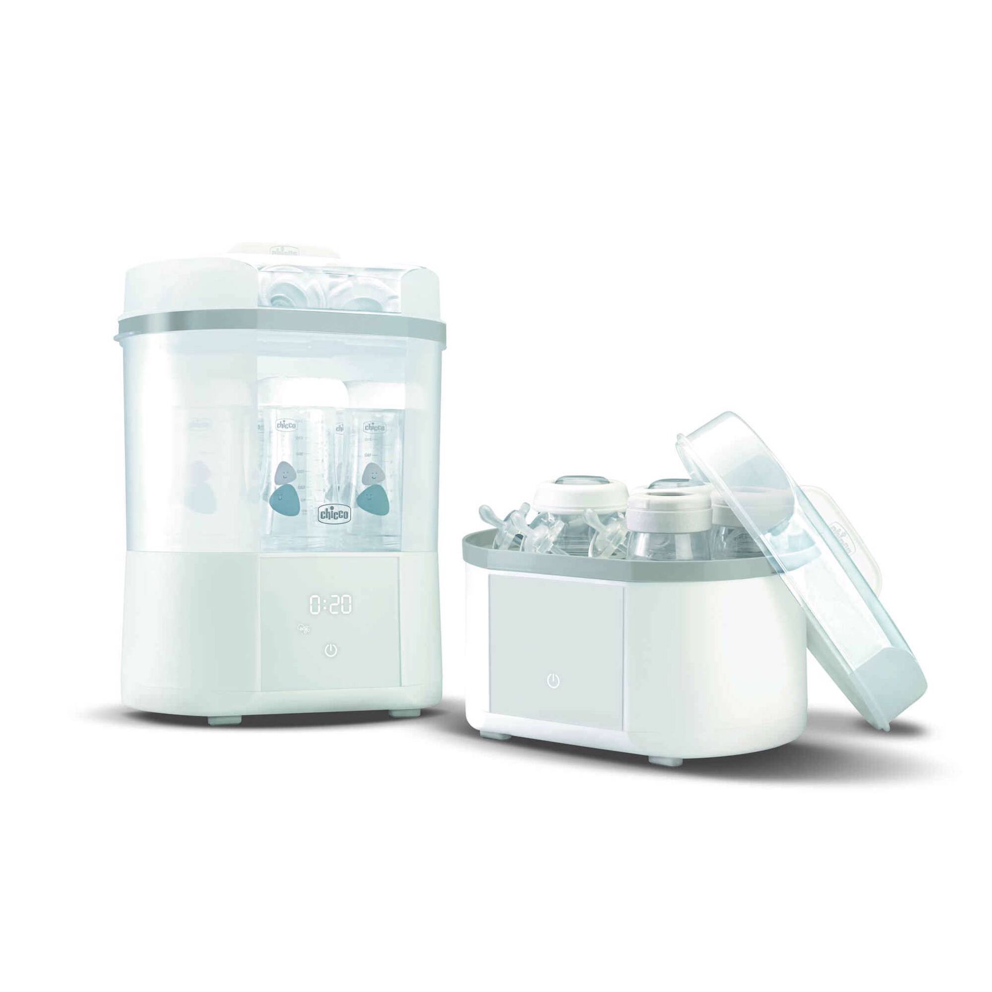 Esterilizador a vapor elétrico. Ajustável. Duas configurações. Prático e eficaz. A nova linha de esterilizadores Chicco adapta-se às necessidades da mãe e do bebé. Pode escolher entre diferentes modelos e configurações, para esterilizar de forma eficaz e eficiente todos os acessórios do bebé. Ocupa pouco espaço na cozinha, graças ao seu prático tamanho. Pode escolher entre 2 configurações diferentes: Full size (Para esterilizar até 6 biberões de 330ml) e Compact size (Para esterilizar até 2 biberões de 330ml, 1 bomba saca-leite e pequenos objetos do bebé, como chupetas), dependendo dos objetos a serem esterilizados. Elimina 99.9% dos germes prejudiciais à saúde. A vapor e sem aditivos químicos.