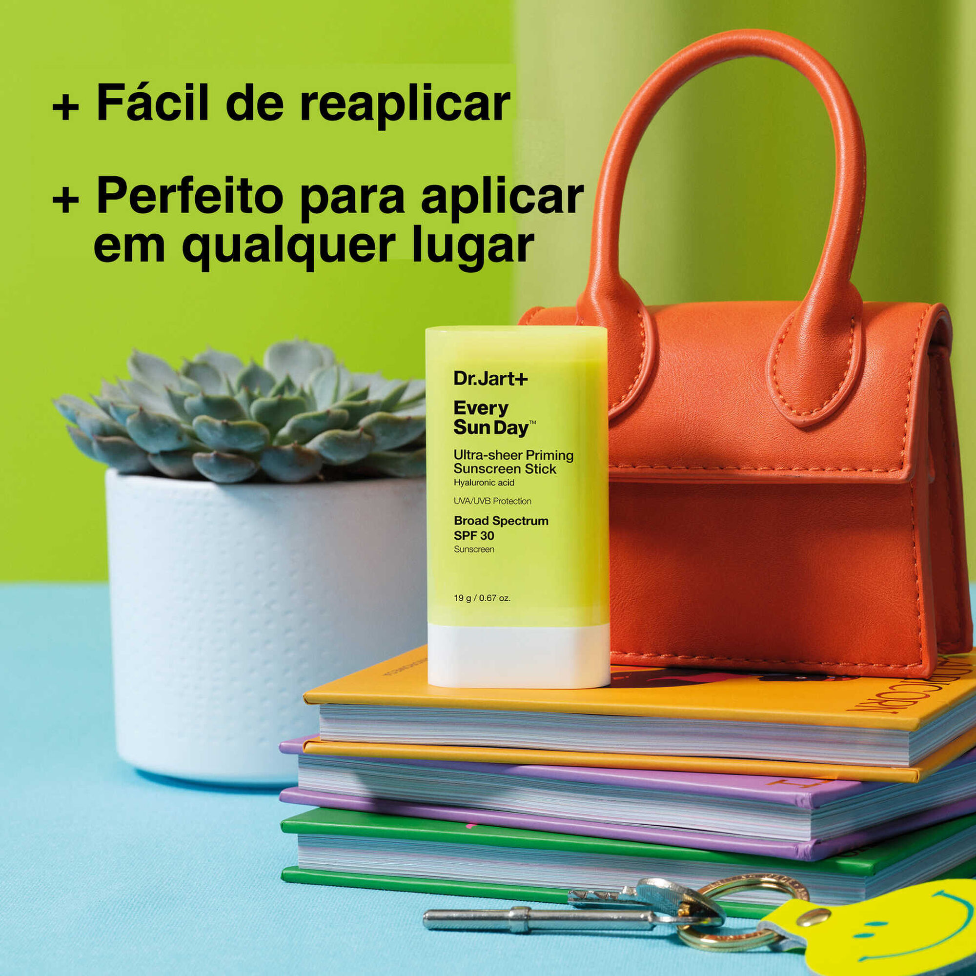 Protetor solar em stick, leve e invisível, com SPF 30 e Ácido Hialurónico que pode ser aplicado sobre ou sob a maquilhagem, e protege, hidrata e disfarça os poros.