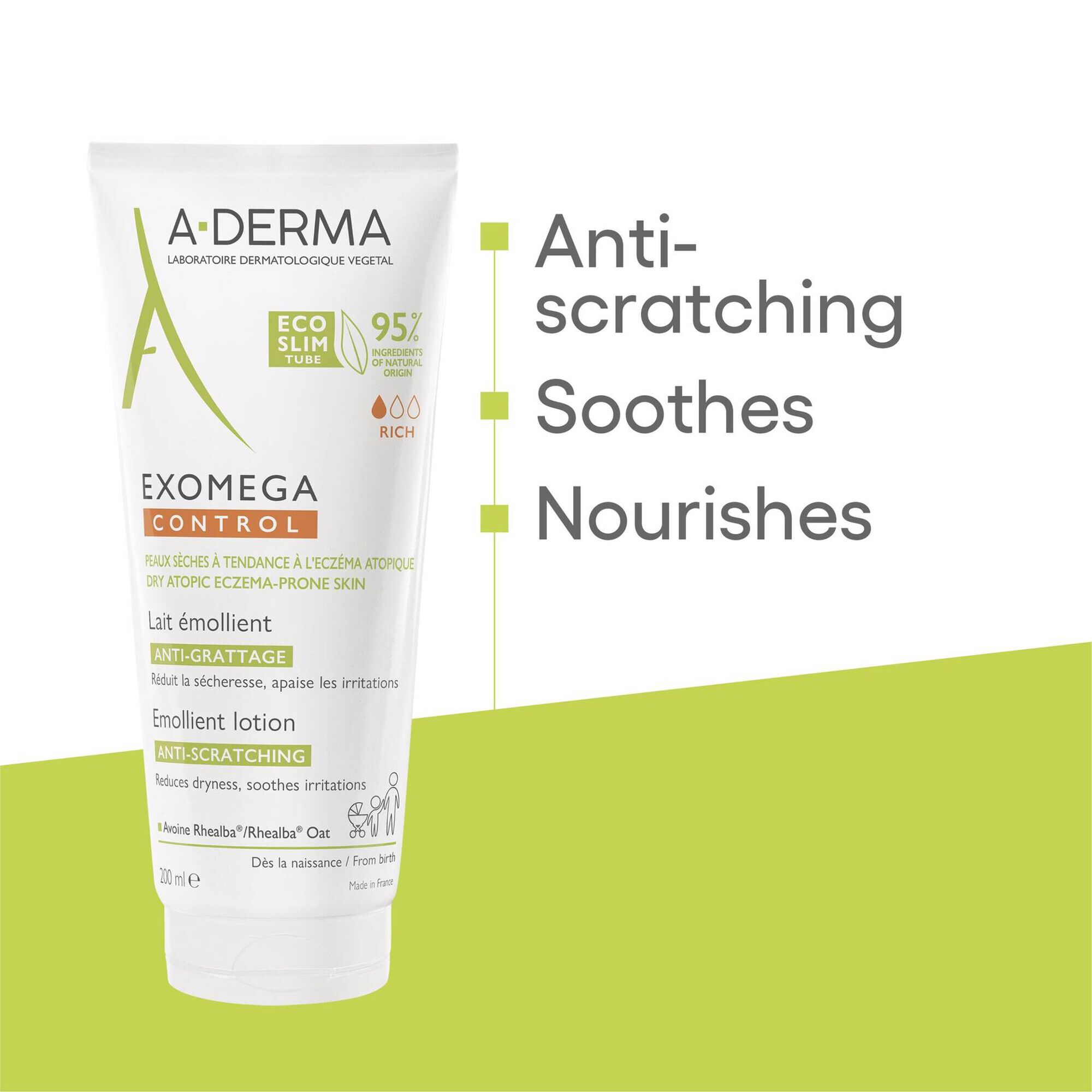 Leite Emoliente Pele Seca Atópica Exomega A-Derma 200ml, indicado para pele de tendência atópica e muito seca. Acalma as irritações e suaviza a pele, reforçada pelas as propriedades suavizantes e moduladoras do Extrato de Plantules de Aveia Rhealba®. Ajuda a reparar a barreira cutânea;. Atua sobre o cimento intercelular. 95% ingredientes Naturais. Cosmética estéril. Sem conservantes. Sem perfume.