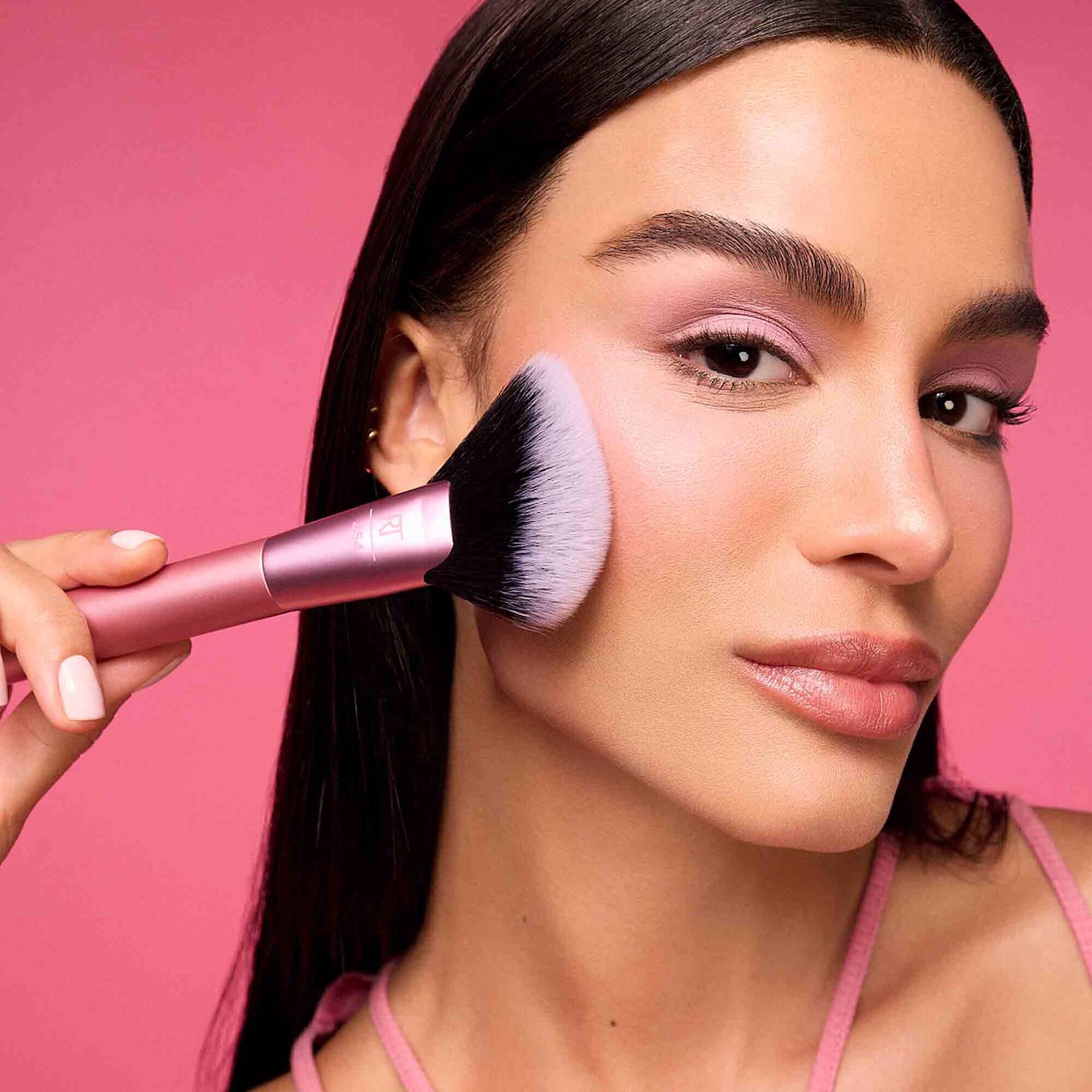 O pincel de acabamento Real Techniques Extra Big tem uma cabeça sobredimensionada, em forma de leque, 35% maior do que as cabeças dos pincéis RT existentes, para realçar a tez rapidamente e contornar sem falhas.