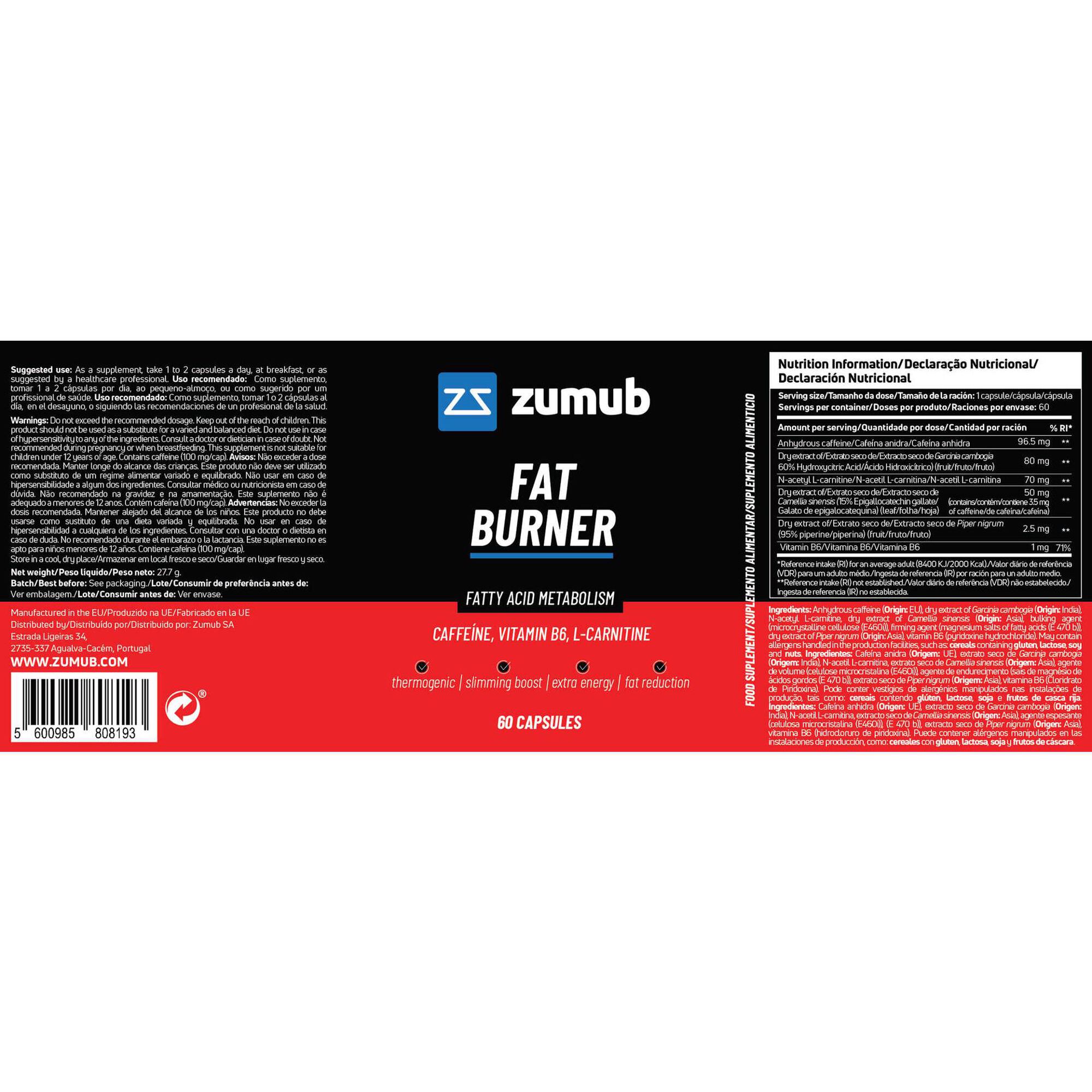 O Fat Burner da Zumub é um suplemento abrangente que apresenta uma combinação poderosa de ingredientes populares para emagrecimento, aumentando os efeitos da prática de atividade física e de uma dieta equilibrada.