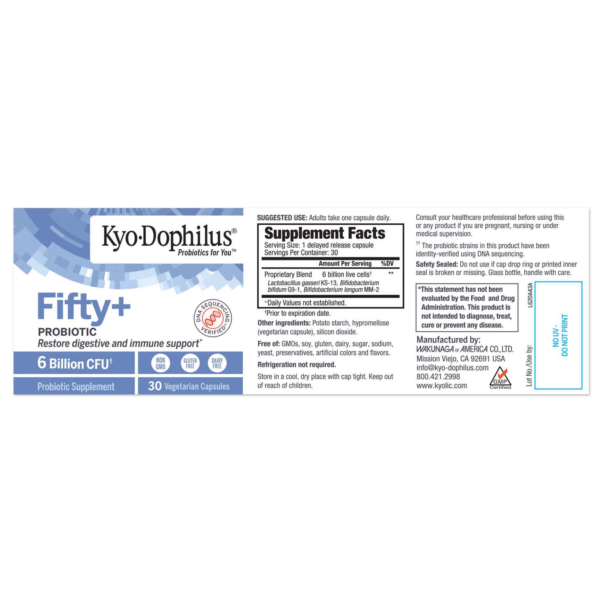 O uso diário de Fifty+ Probiotic pode ajudar a restaurar bactérias boas e aumentar a eficácia do sistema imunológico. Kyo-Dophilus® Fifty Probiotic é formulado com três probióticos de estirpes biocompatíveis com o corpo humano (The Friendly Trio®) Lactobacillus gasseri KS-13, Bifidobacterium bifidum G9-1 e Bifidobacterium longum MM-2 [6 bilhões de células vivas] por porção (1 cápsula de liberação retardada), para restaurar o suporte digestivo e imunológico.