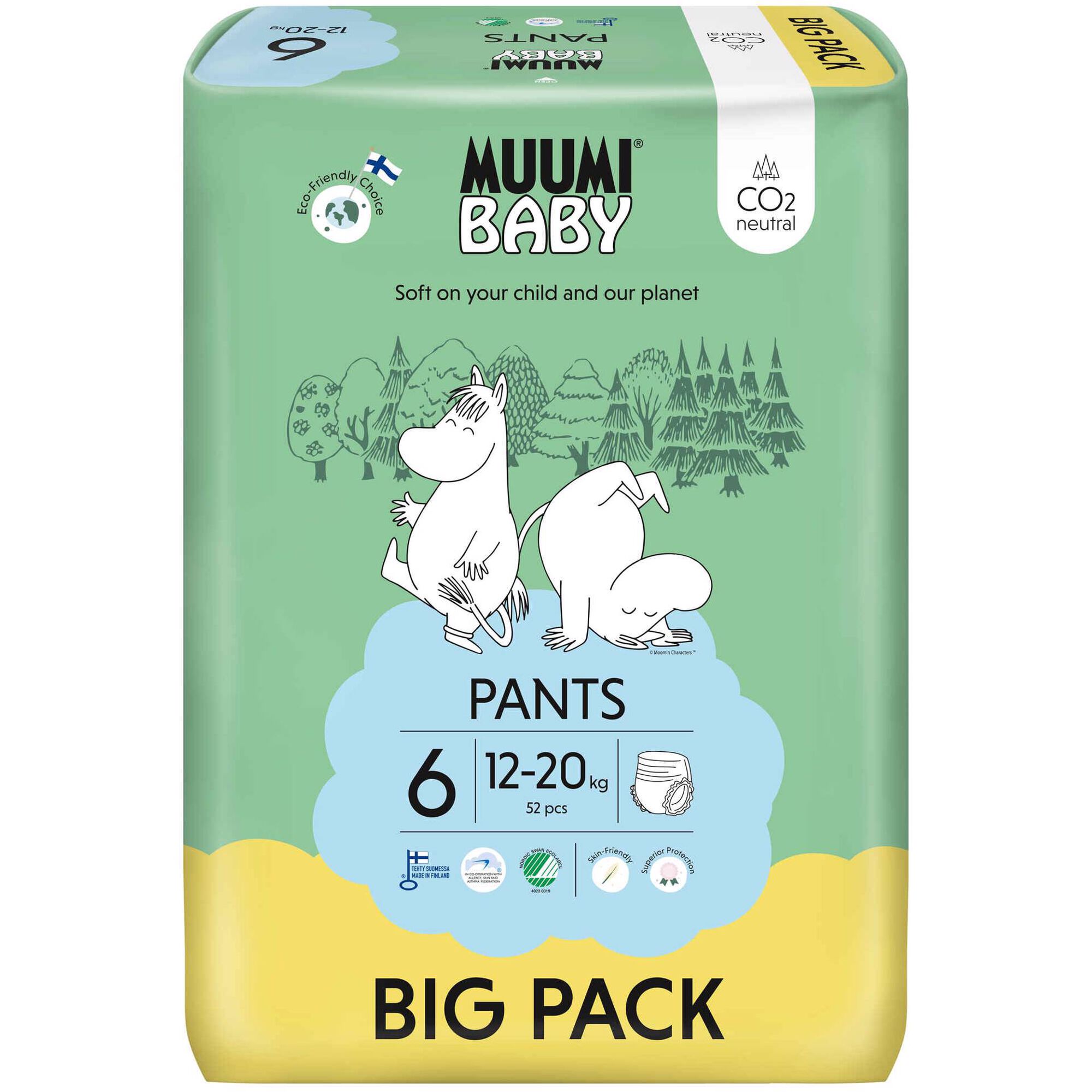Muumi Baby Fraldas são amigas da pele do bebé e cuidam do ambiente. Não contêm nenhum produto químico adicionado, como cloro, fragrâncias, aromas, glifosatos ou loções que possam irritar a pele sensível do bebé. Todos os materiais usados são cuidadosamente escolhidos para que possam ser descartadas como resíduos de energia. Quantidade: 52 fraldas. Tamanho 6 (12-20Kg).