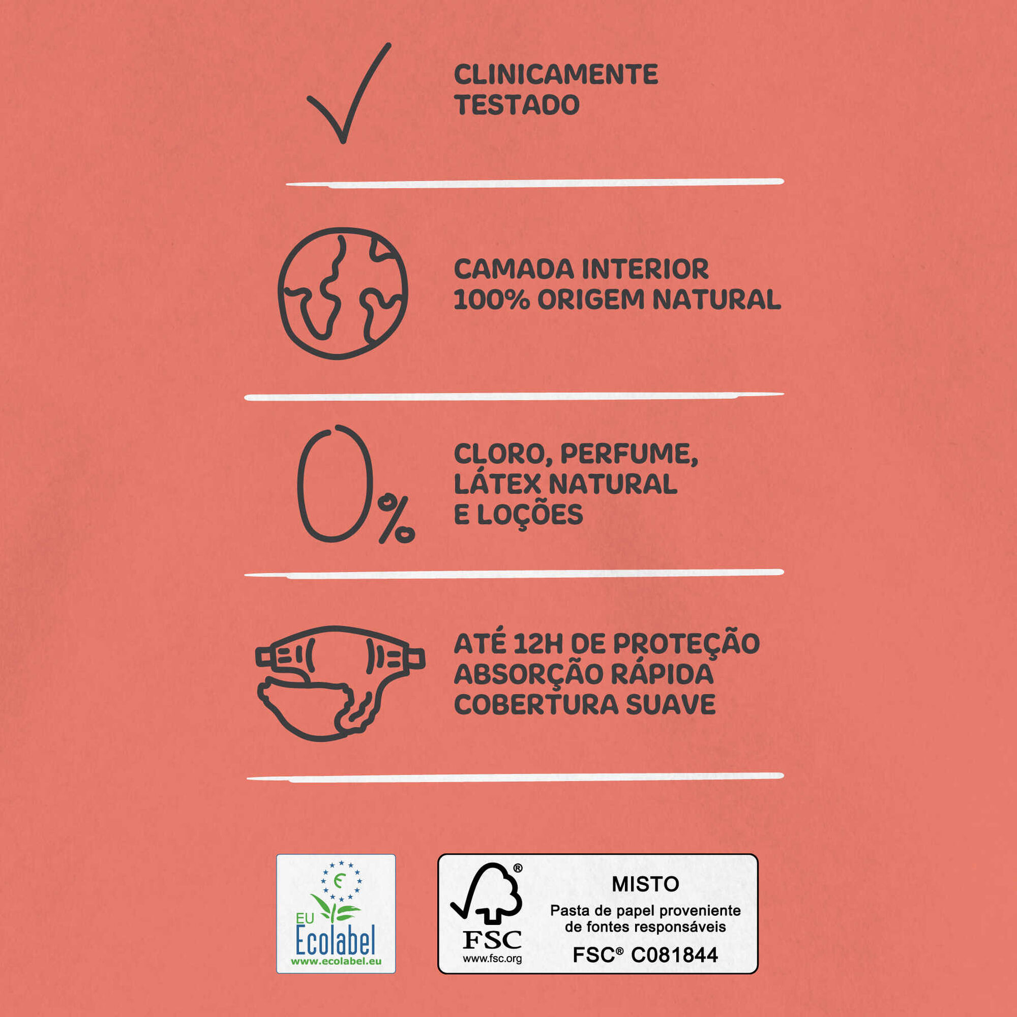 Estas fraldas são uma escolha consciente que ajuda a proteger o nosso planeta. Produzidas com materiais de origem natural tais como cana-de-açúcar, amido de milho, fibras de celulose de fontes renováveis e algodão orgânico. Produto testado dermatologicamente e recomendado por mães.