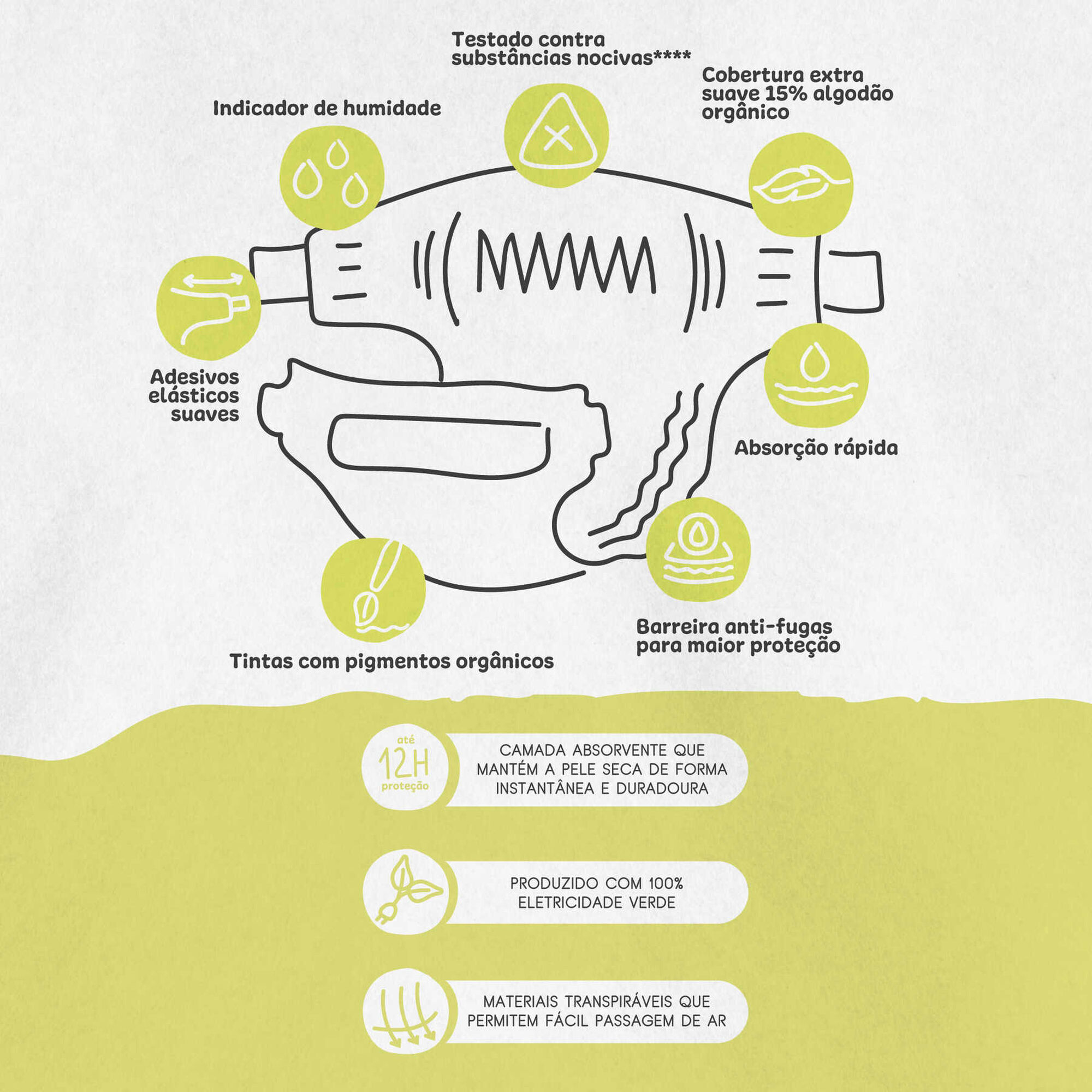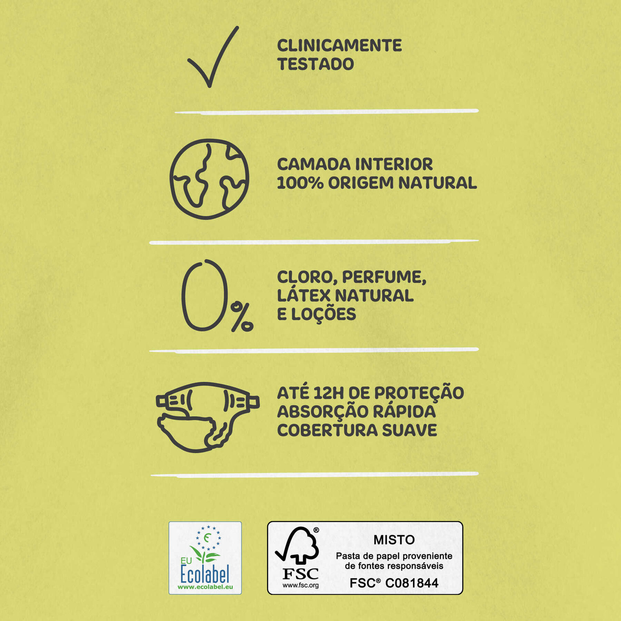 Estas fraldas são uma escolha consciente que ajuda a proteger o nosso planeta. Produzidas com materiais de origem natural tais como cana-de-açúcar, amido de milho, fibras de celulose de fontes renováveis e algodão orgânico. Produto testado dermatologicamente e recomendado por mães.