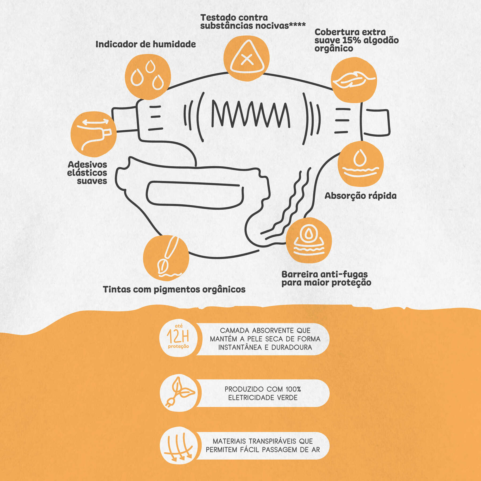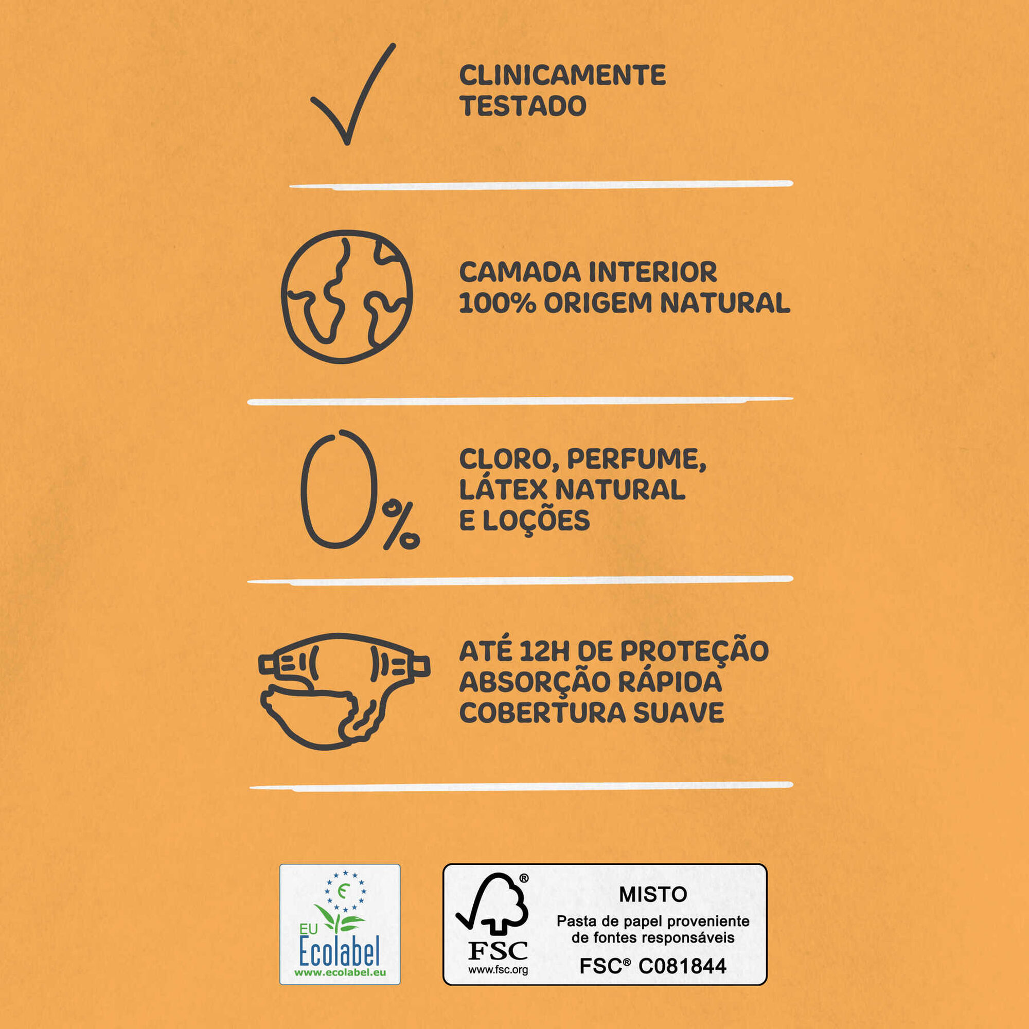 Estas fraldas são uma escolha consciente que ajuda a proteger o nosso planeta. Produzidas com materiais de origem natural tais como cana-de-açúcar, amido de milho, fibras de celulose de fontes renováveis e algodão orgânico. Produto testado dermatologicamente e recomendado por mães.