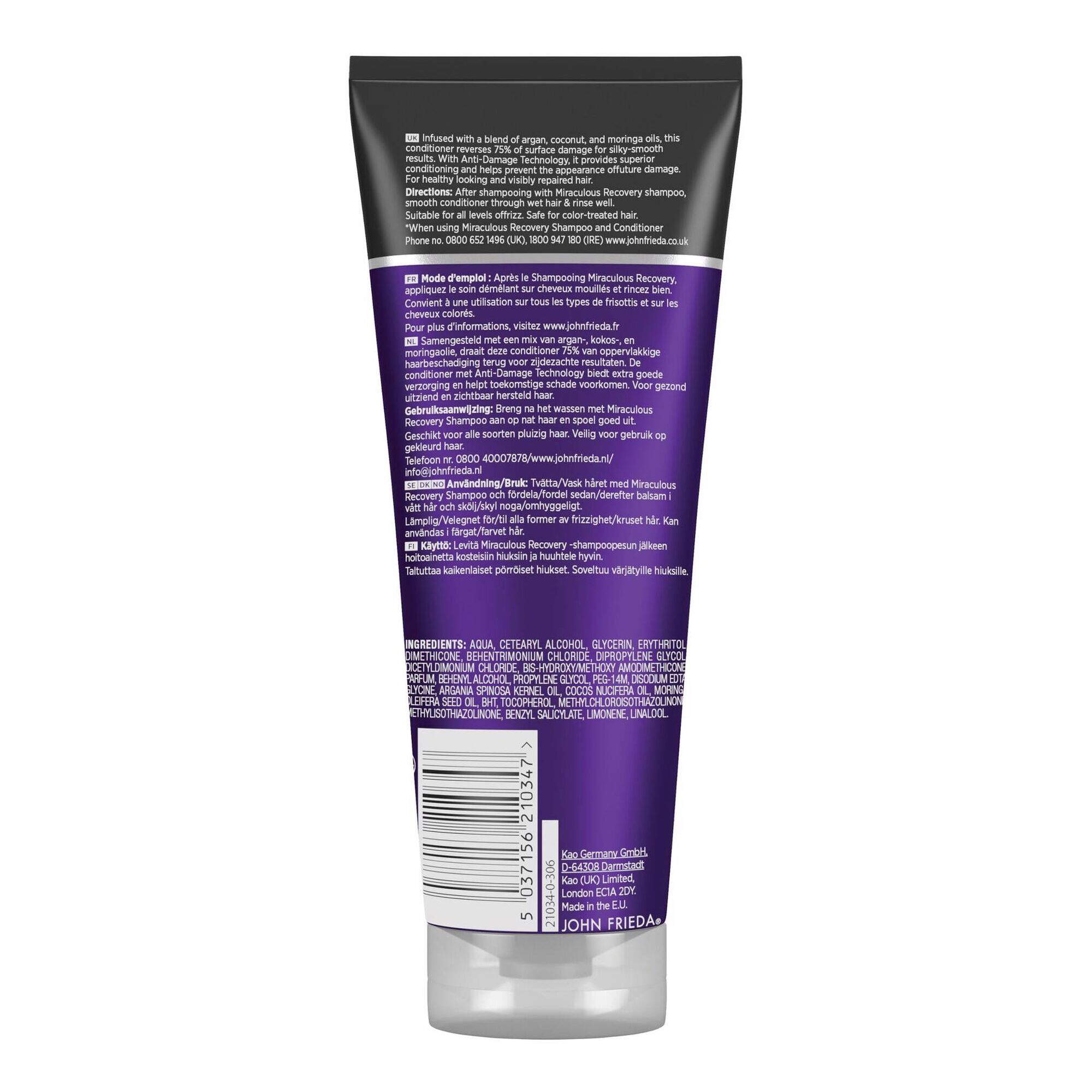 O condicionador de recuperação Miraculous Recovery da marca John Frieda, transforma o teu cabelo seco e danificado num só uso, para um cabelo nutrido, macio e visivelmente luminoso. O condicionador fortalecedor repara o aspeto e a sensação do cabelo seco e danificado pelo calor, logo nos primeiros usos já se obtem resultados visivelmente mais suaves. Ajuda a selar as pontas abertas, para criar qualquer penteado num cabelo saudável.