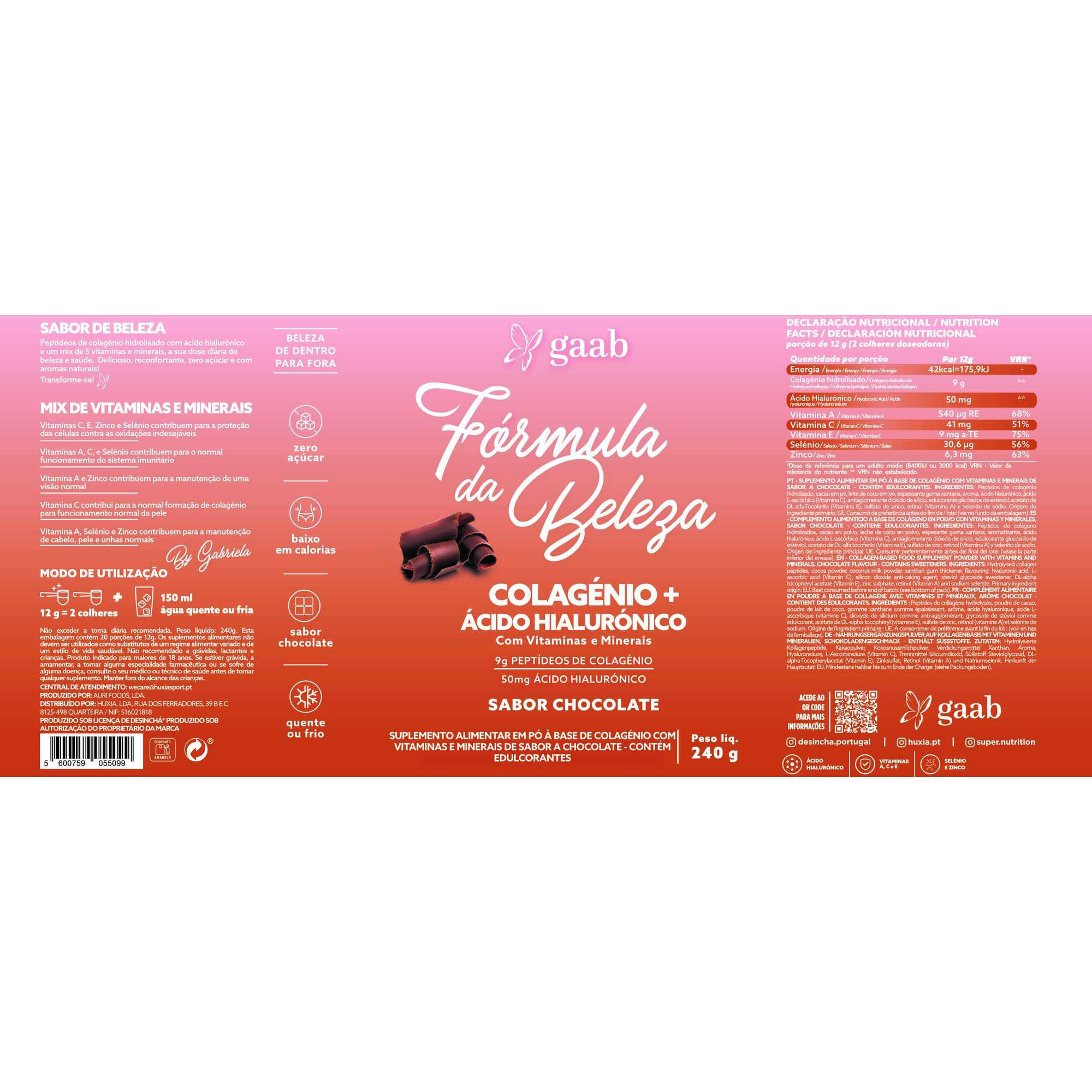A Fórmula da Beleza da marca Gaab é um suplemento alimentar em pó de colagénio, sabor chocolate, e possui na sua fórmula ácido hialurónico e um mix de vitaminas, para melhorar a saúde e beleza da sua pele.