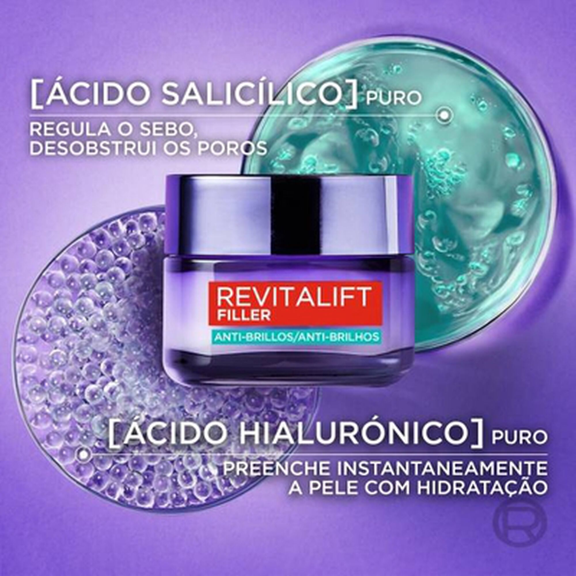 Formulado com ácido hialurónico puro para redensificar a pele e proporcionar uma hidratação intensa, e ácido salicílico puro para ajudar a regular a oleosidade, reduzir a aparência dos poros e controlar os brilhos durante 8 horas*.