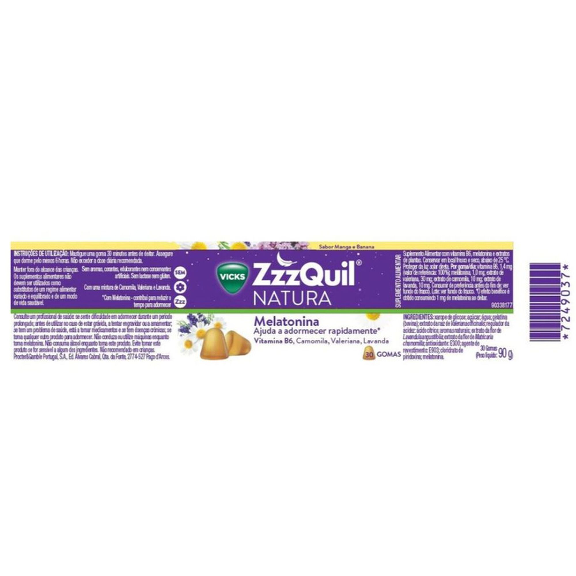 ZzzQuil Manga Banana, em formato de gomas, é um suplemento alimentar com melatonina (1 mg), vitamina B6 e extratos de plantas (camomila, lavanda e valeriana) para ajudar a adormecer rapidamente* e sem habituação conhecida.