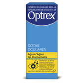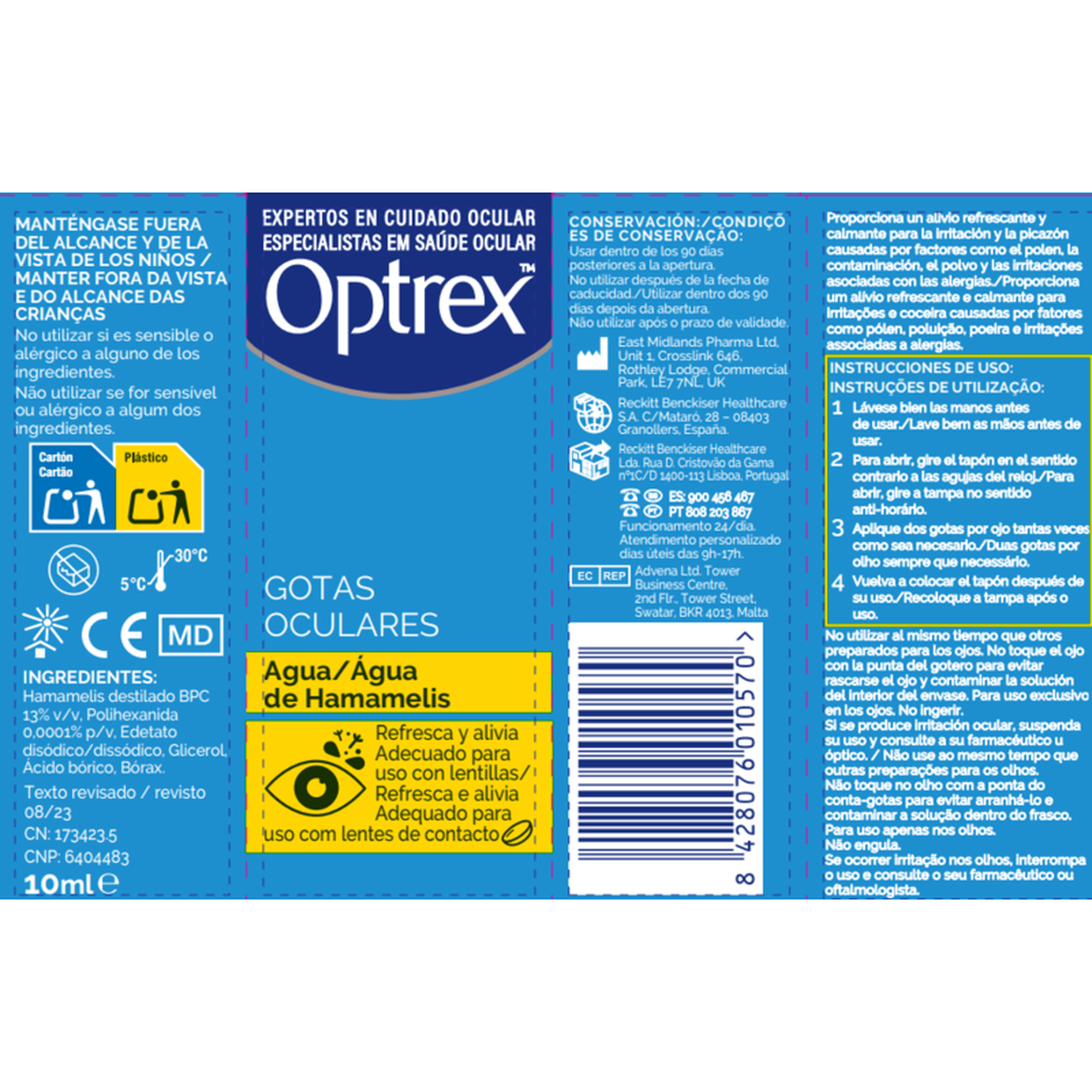 Colírio Água de Hamamelis Optrex contém extratos naturais de plantas e ajuda a aliviar a irritação e desconforto ocular.
