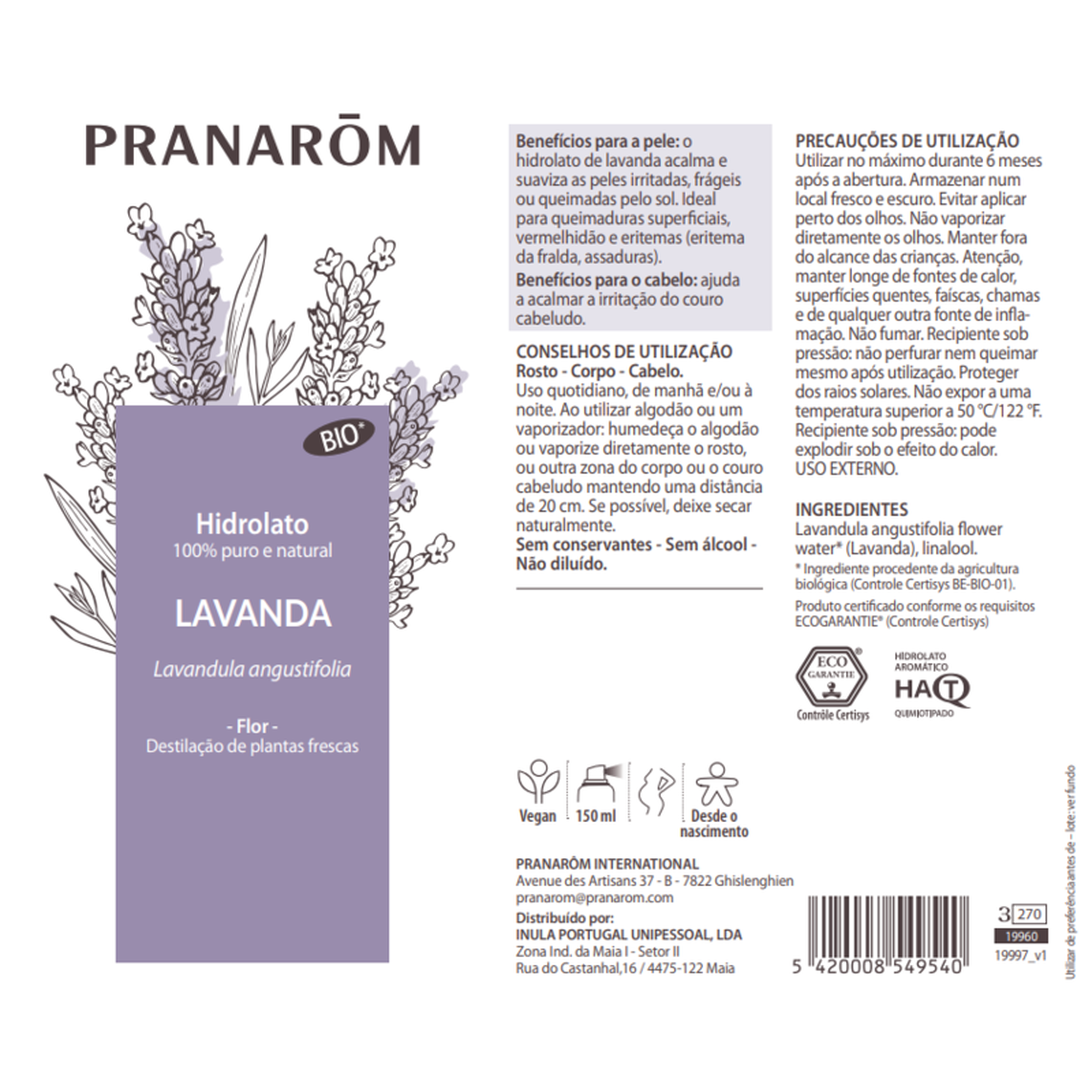 O hidrolato de lavanda é ideal no cuidado da pele: este spray suaviza a pele irritada, frágil ou exposta ao sol graças ao seu efeito calmante. Ideal em caso de pequenas queimaduras, irritações e eritemas (para o rabo do bebé, assaduras).