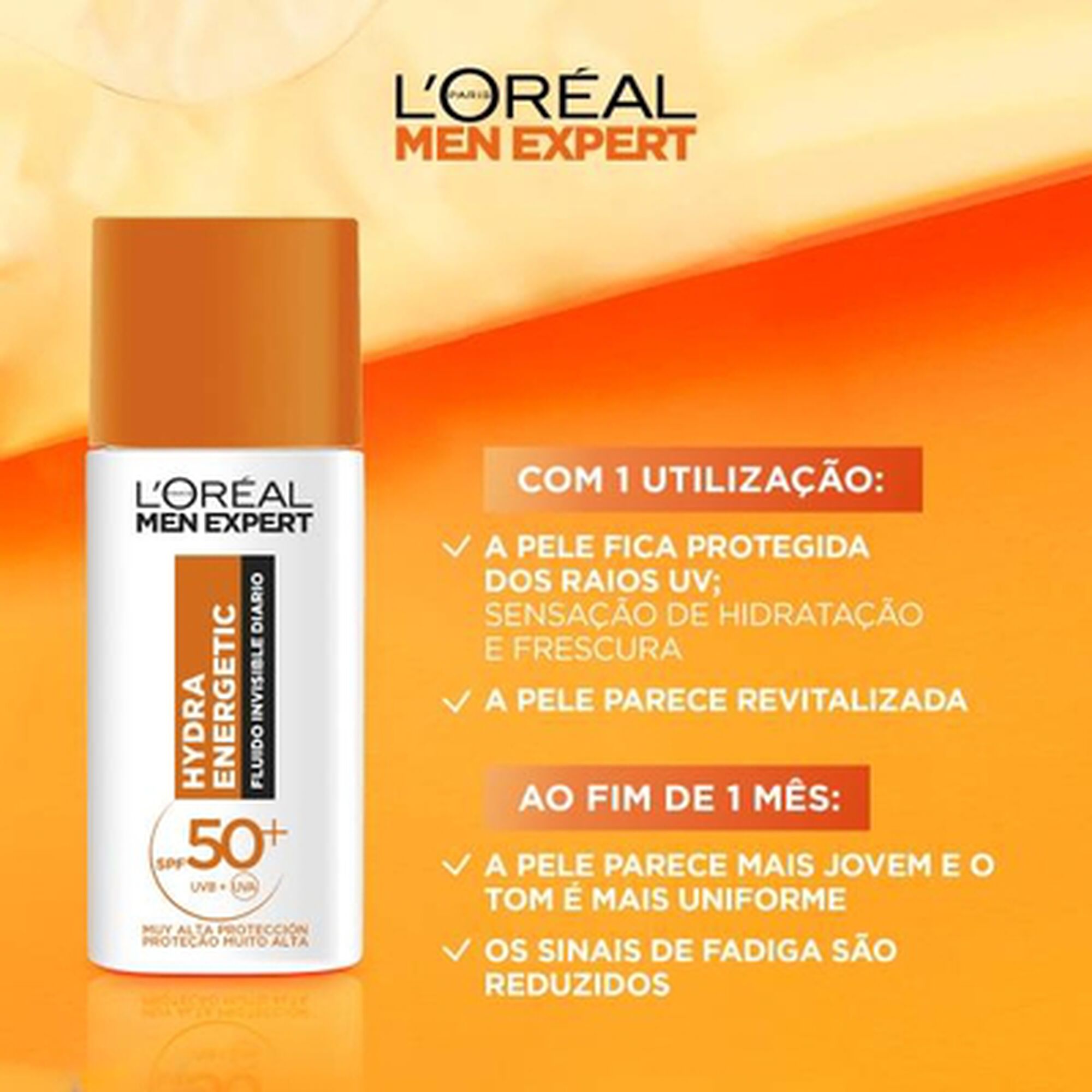 Descubra o fluído invisível diário Hydra Energetic FPS50+, de L'Oréal Paris Men Expert, um protetor solar avançado, formulado especialmente para homens. A sua fórmula combina a poderosa ação antioxidante da Vitamina C, com a tecnologia revolucionária Netlock™, oferecendo uma proteção UVB/UVA altamente resistente.