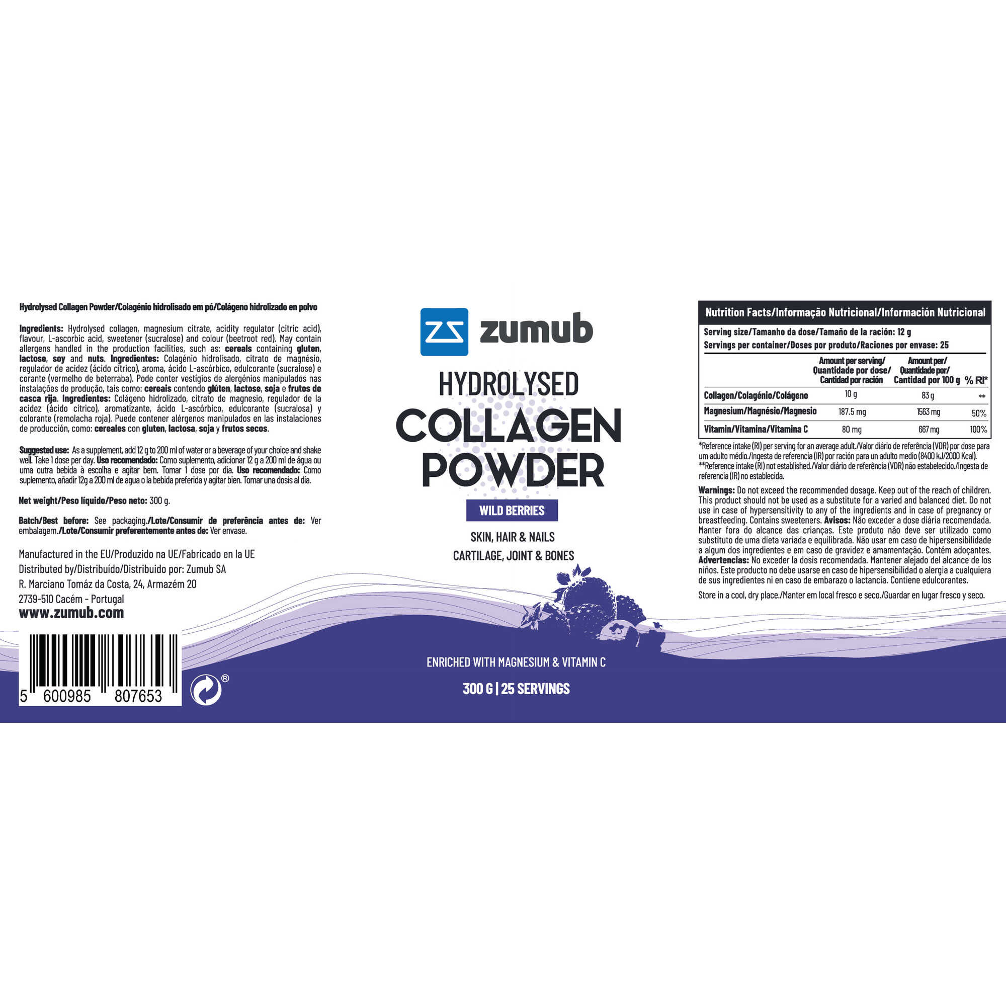Colagénio Hidrolisado em Pó Zumub é um suplemento alimentar de alta qualidade, formulado com colagénio hidrolisado de origem bovina, enriquecido com magnésio e vitamina C. Apresenta-se em pó com sabor a frutos do bosque, pensado para quem procura uma forma prática de apoiar a saúde dos ossos, articulações, cartilagens, pele, cabelo e unhas.