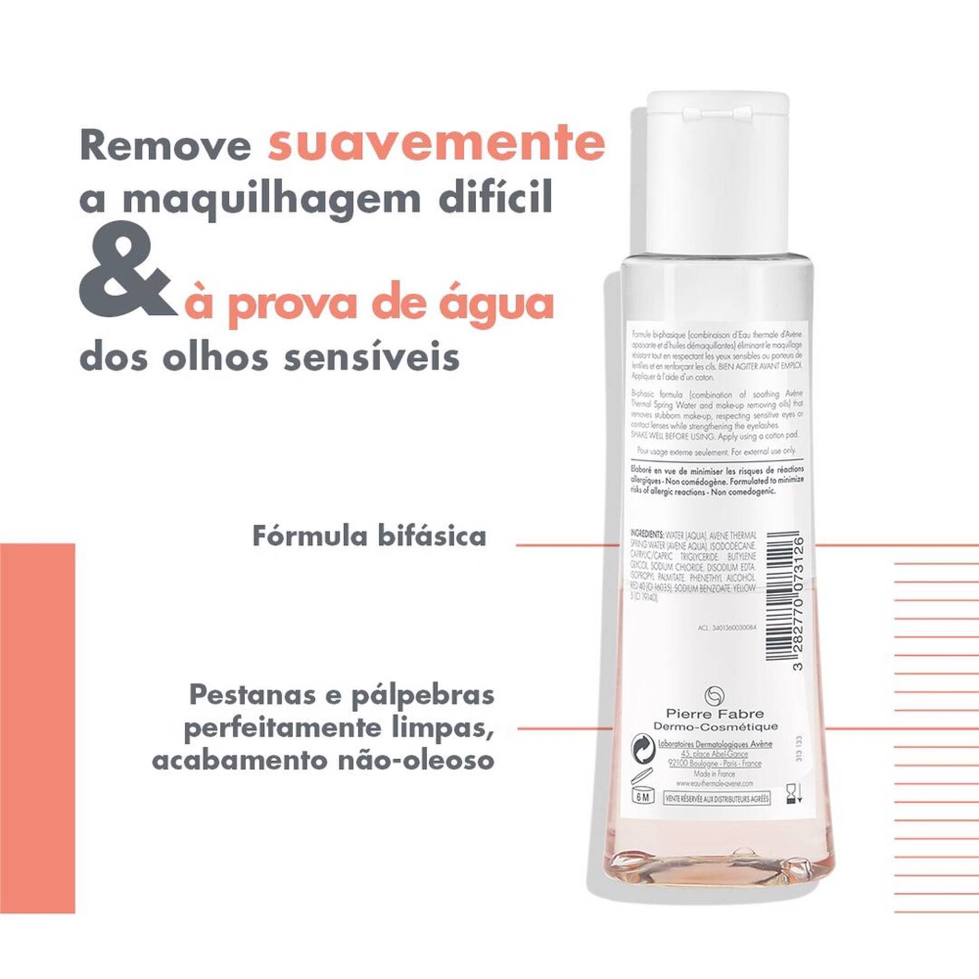 A sua fórmula bifásica, uma combinação de água termal d'Avène calmante e óleos de limpeza, garante uma remoção eficaz e confortável da maquilhagem à prova de água.