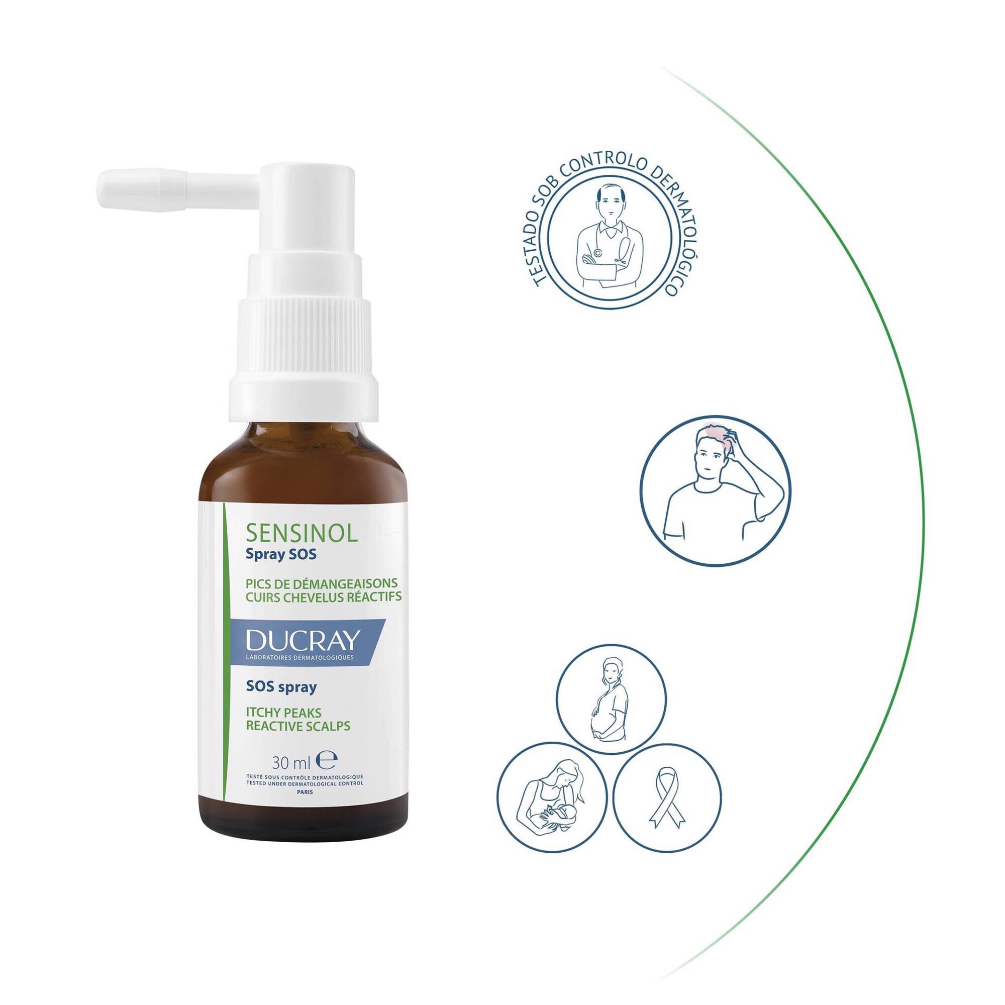 Sensinol Spray SOS é uma solução sem enxaguamento que acalma instantaneamente 100% dos picos de prurido¹ provenientes do couro cabeludo irritado.