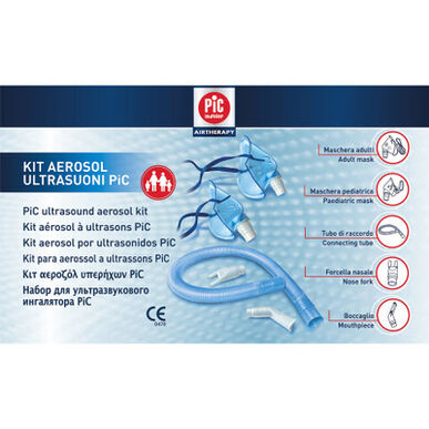 Kit constituído por máscara 2 em 1 (adultos e crianças), tubo de ligação ao aerossol, forquilha nasal e boquilha. Compatível com o aerossol Air Project. Para nebulização de medicamentos ou soro fisiológico. Dispositivo Médico.