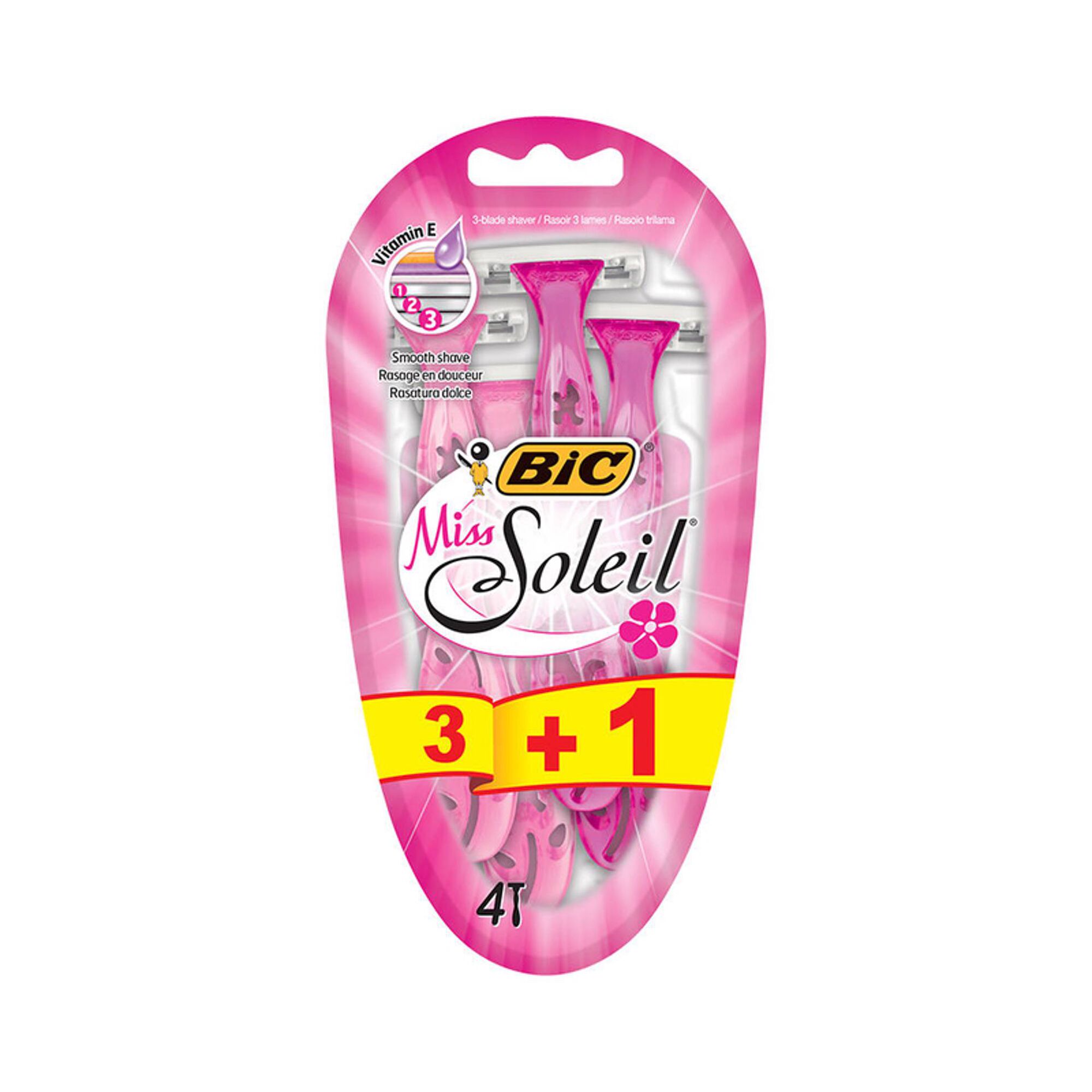 As Lâminas Descartáveis Miss Soleil para Mulher oferecem uma tira Lubrificante Dupla de Vitamina E e Pegas Florais Rosa.
