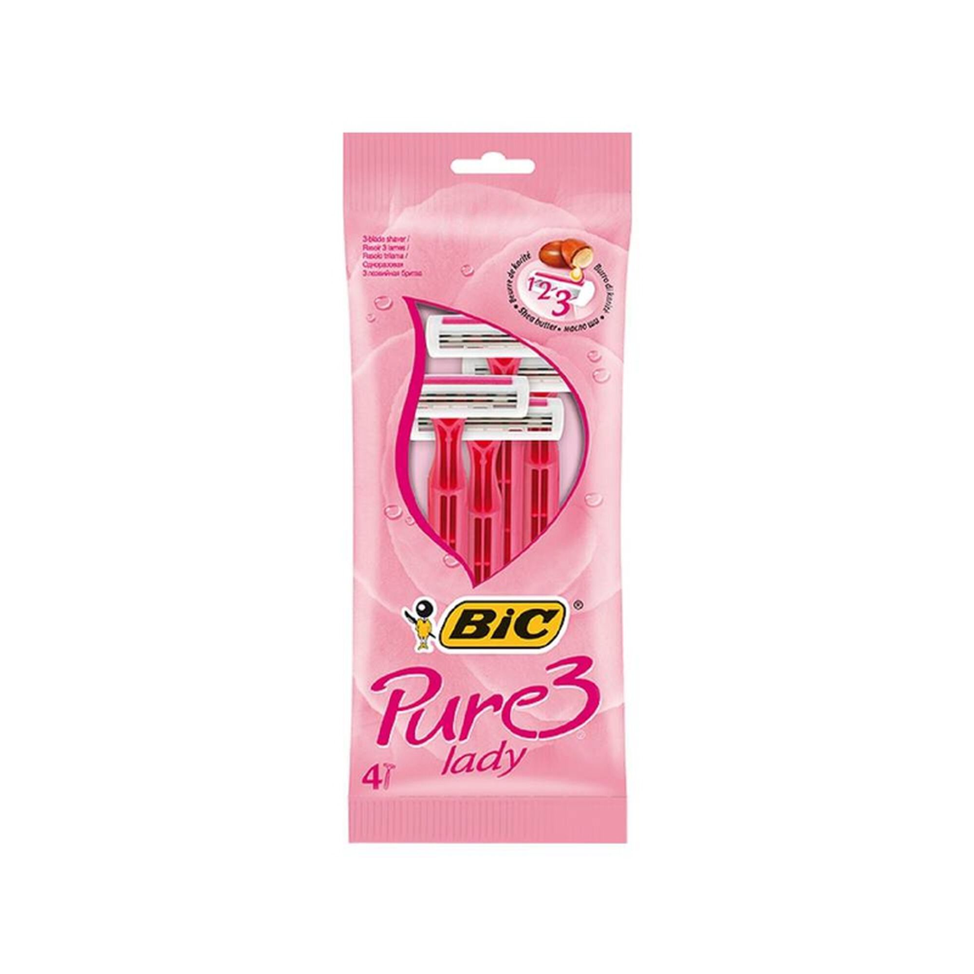 As Lâminas Descartáveis Pure 3 Pink para Mulher com tecnologia de 3 lâminas de aço inoxidável de alta qualidade e uma tira hidratante enriquecida com gel de karité para um deslizamento suave.