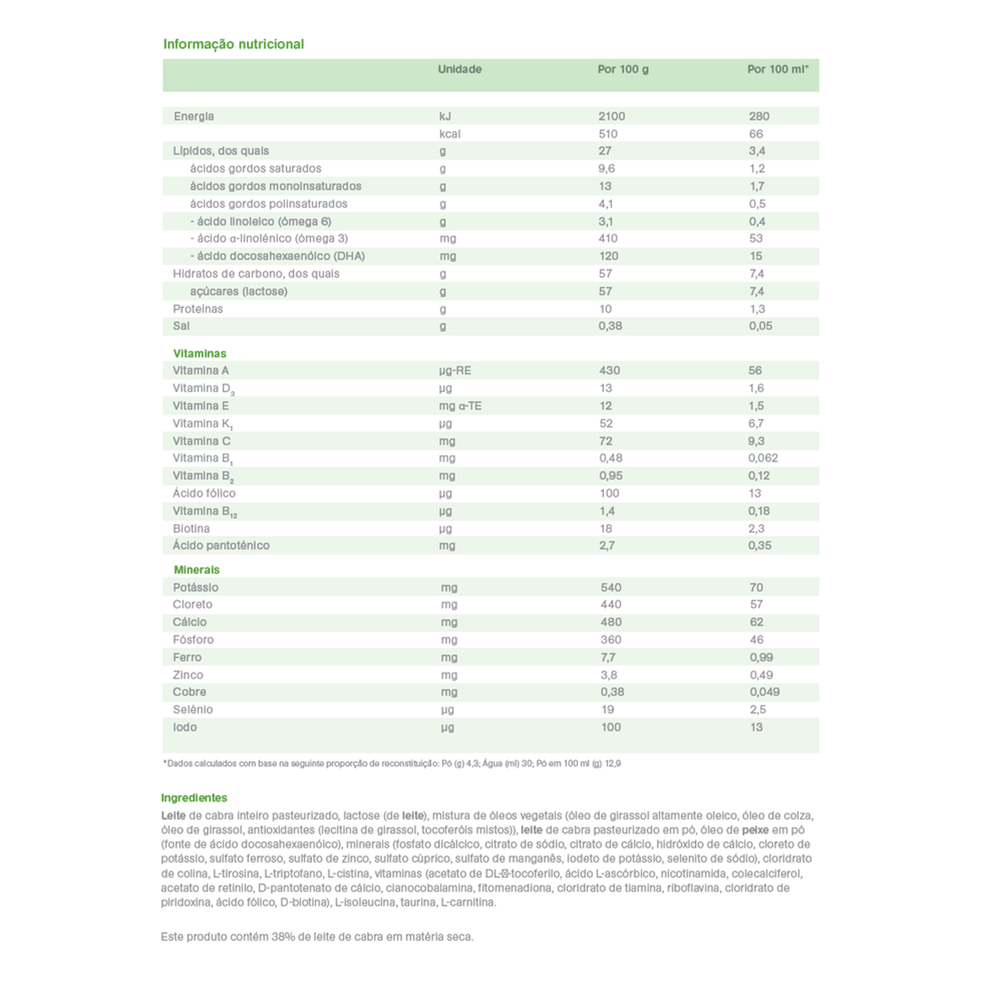 Este produto contém 38% de leite de cabra em matéria seca.