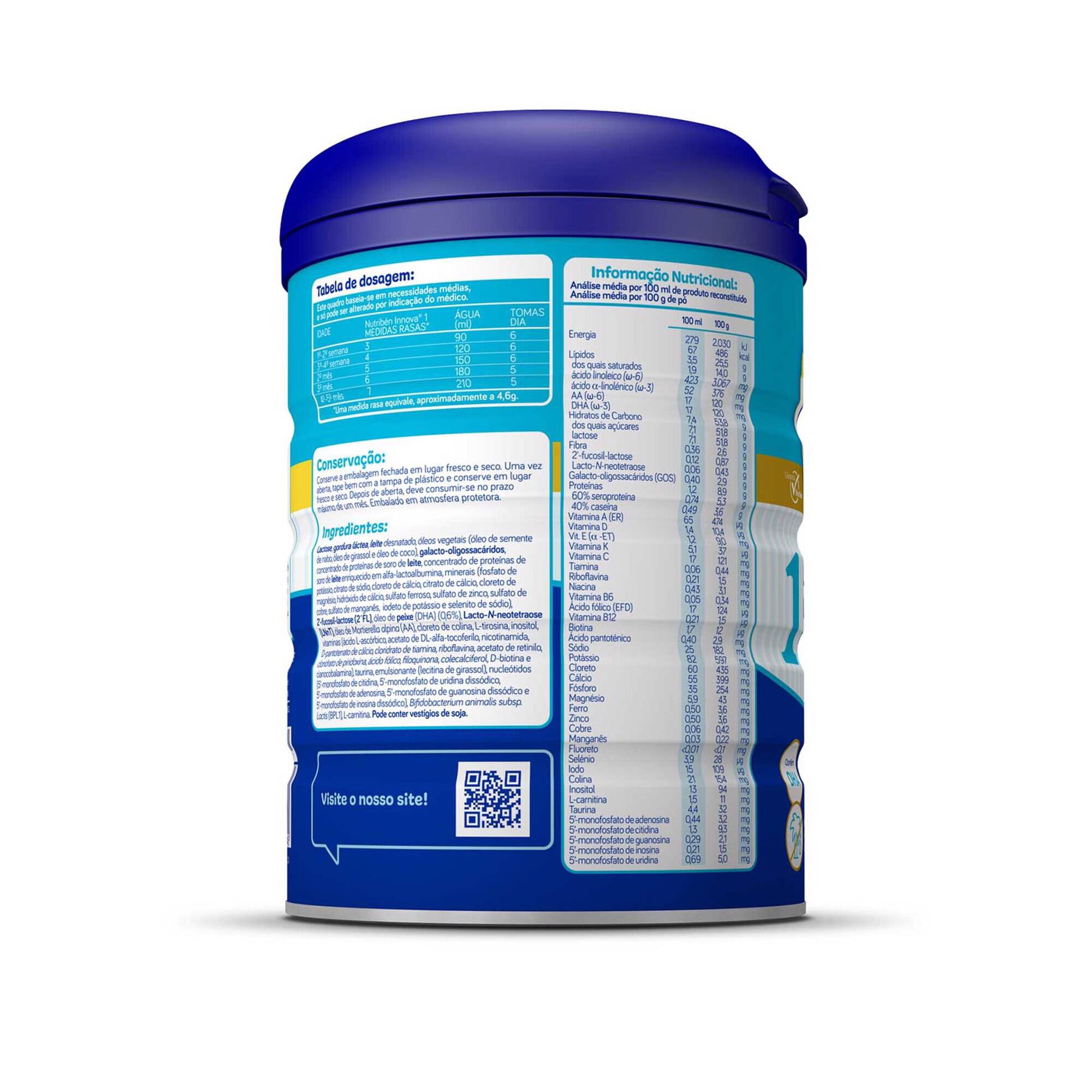 Lactose, gordura láctea, leite desnatado, óleos vegetais (óleo de girassol, óleo de semente de nabo, óleo de coco), galacto-oligossacáridos, concentrado de proteínas de soro de leite, concentrado de proteínas de soro de leite enriquecido em α-lactoalbumina, minerais (fosfato de potássio, citrato de cálcio, citrato de sódio, cloreto de cálcio, cloreto de magnésio, hidróxido de cálcio, sulfato ferroso, sulfato de zinco, sulfato de cobre, sulfato de manganês, iodeto de potássio e selenito de sódio), 2’fucosil-lactose (2’FL), óleo de peixe (DHA) (0,6%), Lacto-N-neotetraose (LNnT), óleo de Mortierella alpina (AA; 0,1%), cloreto de colina L-tirosina, vitaminas (ácido L-ascórbico, acetato de DL-α-tocoferol, nicotinamida, D-pantotenato de cálcio, acetato de retinol, cloridrato de tiamina, riboflavina, cloridrato de piridoxina, ácido fólico, filoquinona, colecalciferol, D-biotina e cianocobalamina), inositol, taurina, emulsionante (lecitina de girassol), nucleótidos (5’-monofosfato de citidina, 5’-monofosfato de uridina dissódico, 5’-monofosfato de adenosina, 5’-monofosfato de guanosina dissódico e 5’-monofosfato de inosina dissódico), Bifidobacterium lactis, L-carnitina. Pode conter vestígios de soja.