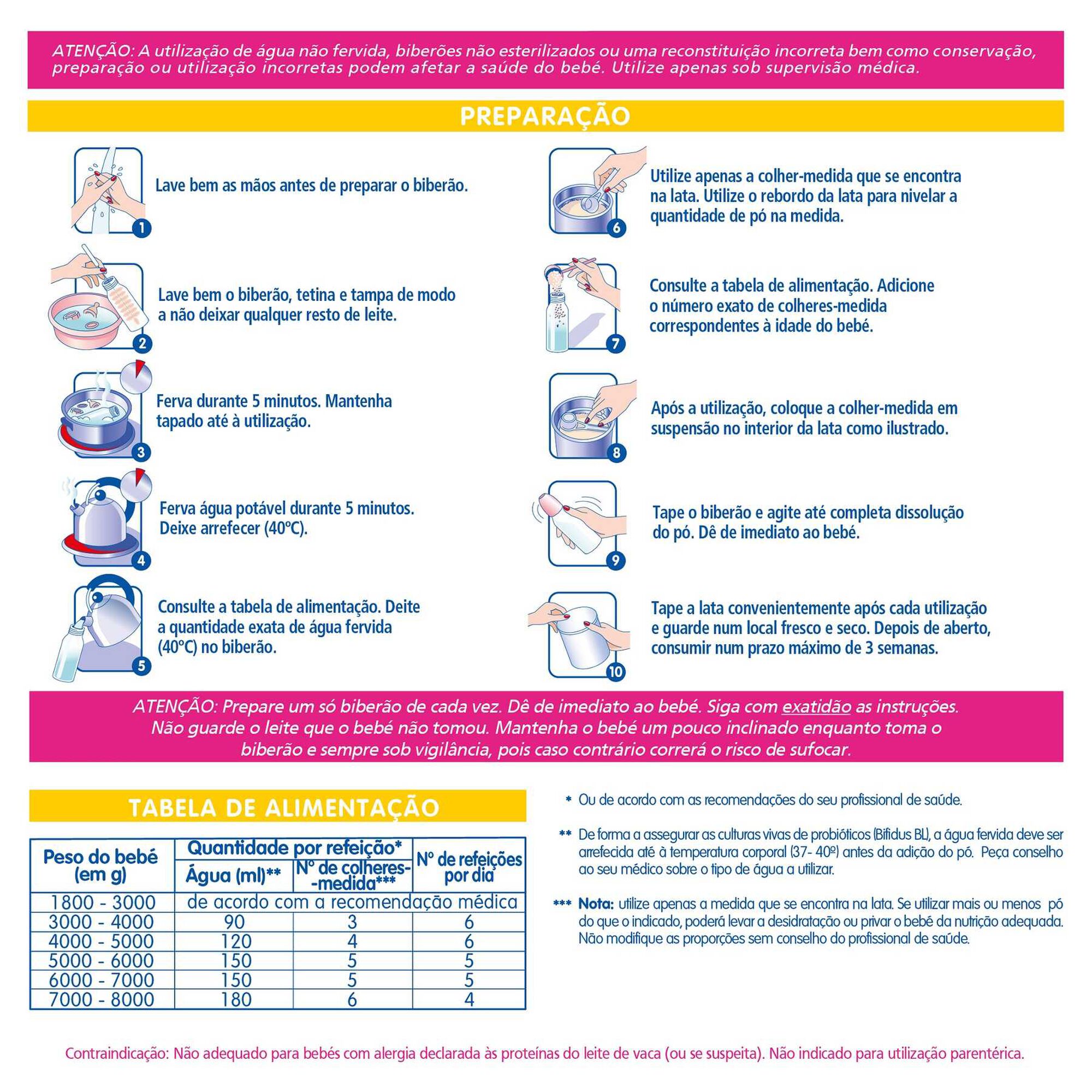 Lave bem as mãos antes de preparar o biberão; Lave bem o biberão, tetina e tampa de modo a não deixar qualquer resto de leite; Ferva durante 5 minutos. Mantenha tapado até à utilização; Ferva água potável durante 5 minutos. Deixe arrefecer (40ºC); Consulte a tabela de alimentação. Deite a quantidade exata de água fervida (40ºC) no biberão; Utilize apenas a colher-medida que se encontra na embalagem; Consulte a tabela de alimentação. Adicione o número exato de colheres-medida correspondentes à idade do bebé; Tape o biberão e agite até completa dissolução do pó. Dê de imediato ao bebé.