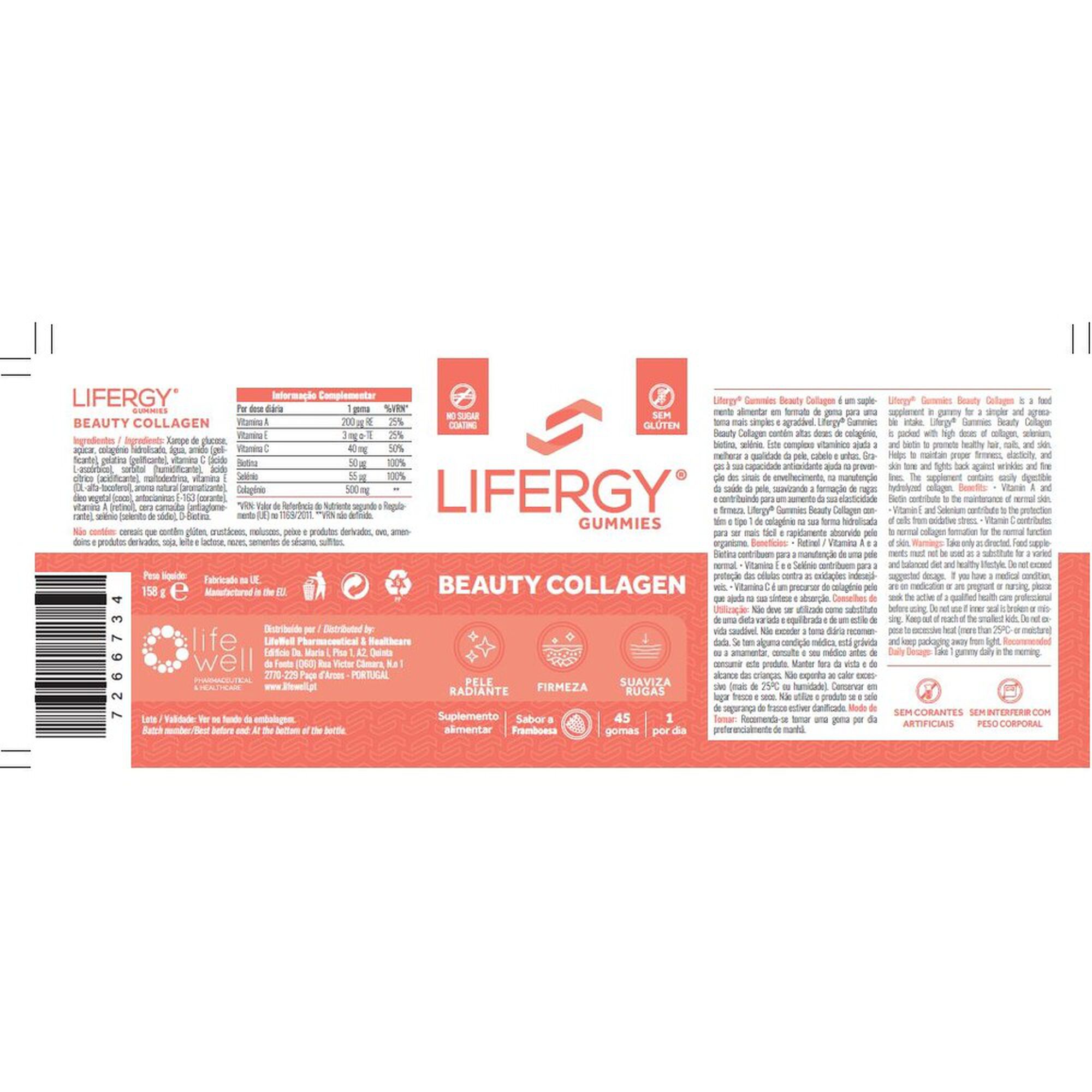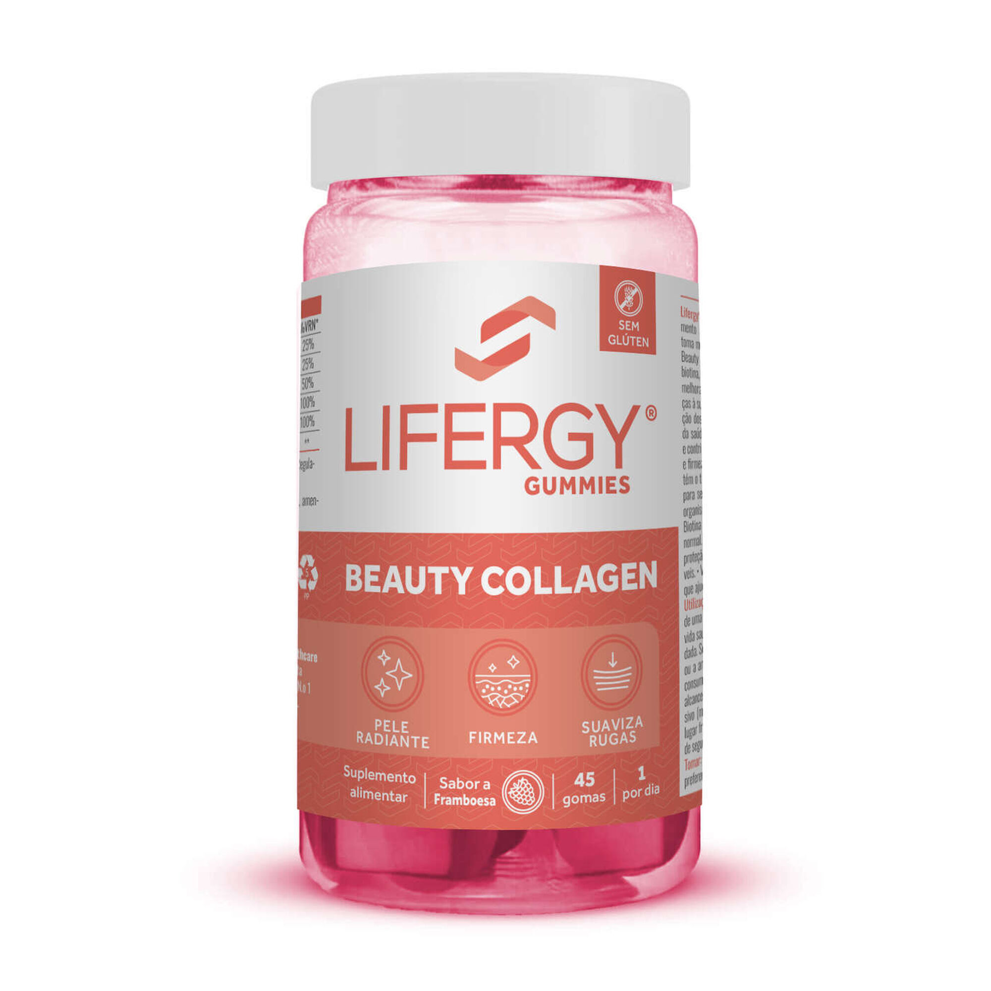 Lifergy Gummies Beauty Collagen é um suplemento alimentar em formato de goma com sabor a framboesa, contribui para melhorar a firmeza e elasticidade da pele e ajuda na prevenção dos sinais de envelhecimento. Contém altas doses de Colagénio, Biotina e Selénio. Graças à sua capacidade antioxidante ajuda na prevenção dos sinais de envelhecimento, na manutenção da saúde da pele, suavizando a formação de rugas e contribuindo para um aumento da sua elasticidade e firmeza. Contém o tipo 1 de Colagénio na sua forma hidrolisada para ser mais fácil e rapidamente absorvido pelo organismo.