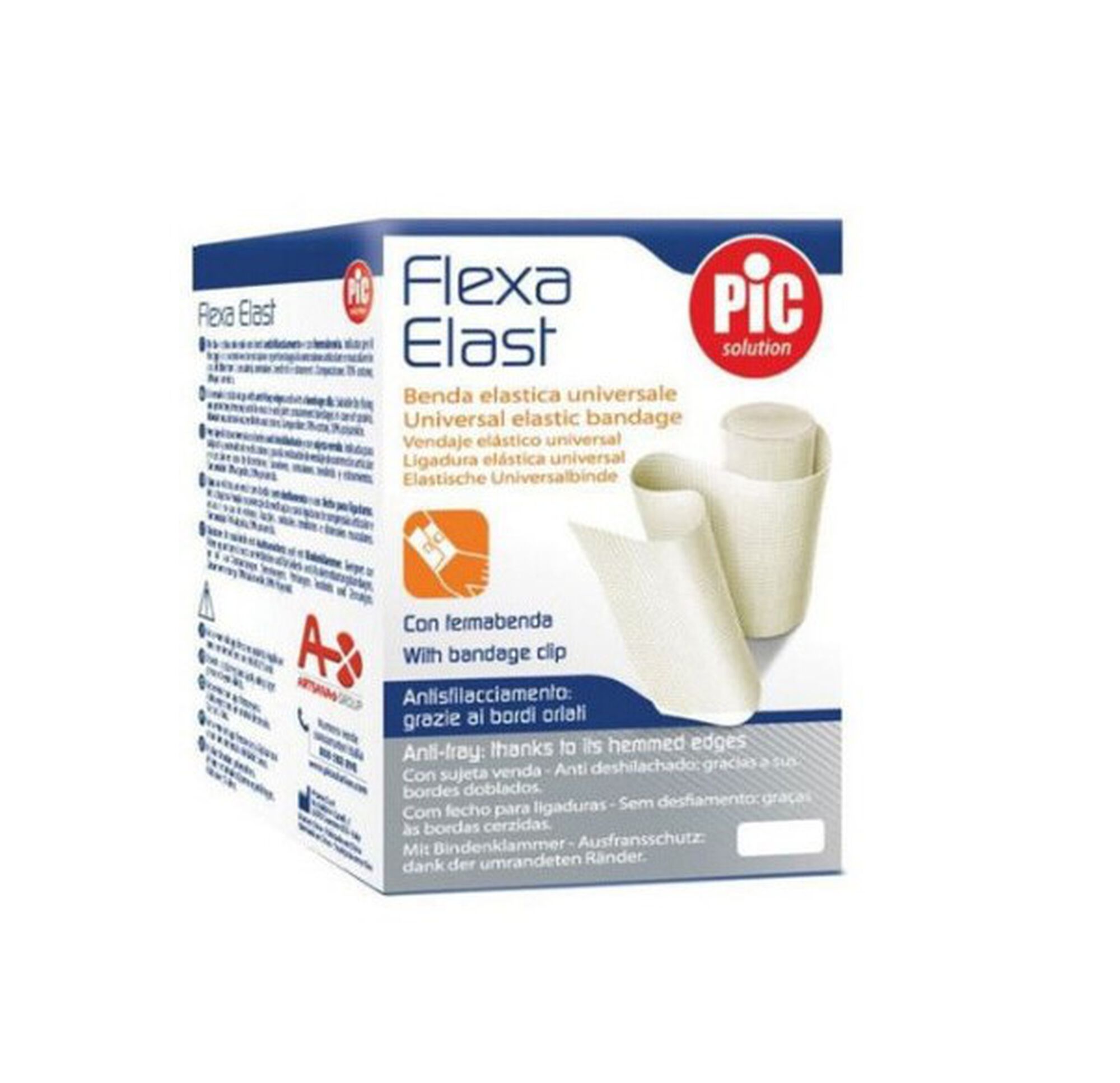 Ligadura elástica universal com clip de fecho. Bordo cerzido, não desfia. Indicado para a fixação de medicação e para compressão articular e muscular. Elasticidade nivel 2. Dispositivo Médico.
