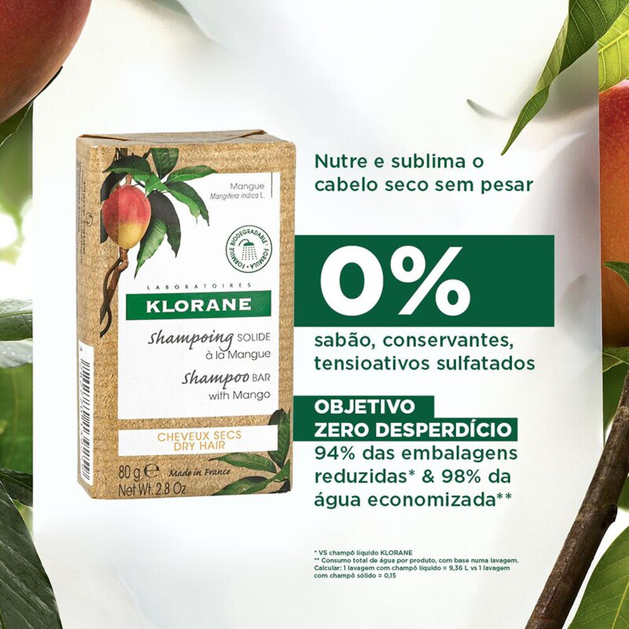 1 CH SÓLIDO = 2 EMBALAGENS(Um champô sólido de 80g permite realizar entre 32 e 44 lavagens praticamente o mesmo que duas embalagens de 200ml. A ponderar mediante o tamanho e grossura do fio de cabelo). 94% menos embalagem(Vs champô liquido Klorane). 98% de água economizada(Consumo de água total por produto, na base de uma lavagem. Cálculo: 1 lavagem champô líquido= 9.36L vs 1 lavagem champô sólido=0.15L).