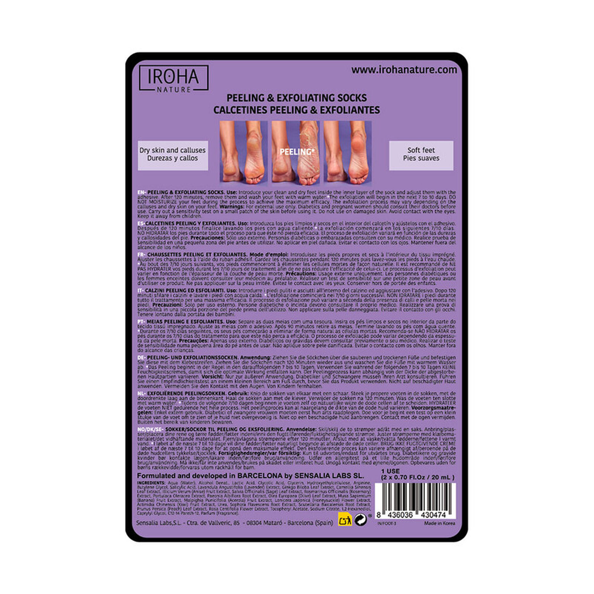 A máscara de pés Peeling and Exfoliation da Iroha Nature apresenta uma fórmula clean concentrada de ácido glicólico e ácido lático, com 99% de ingredientes de origem natural, para remover a pele morta e obter pés macios.