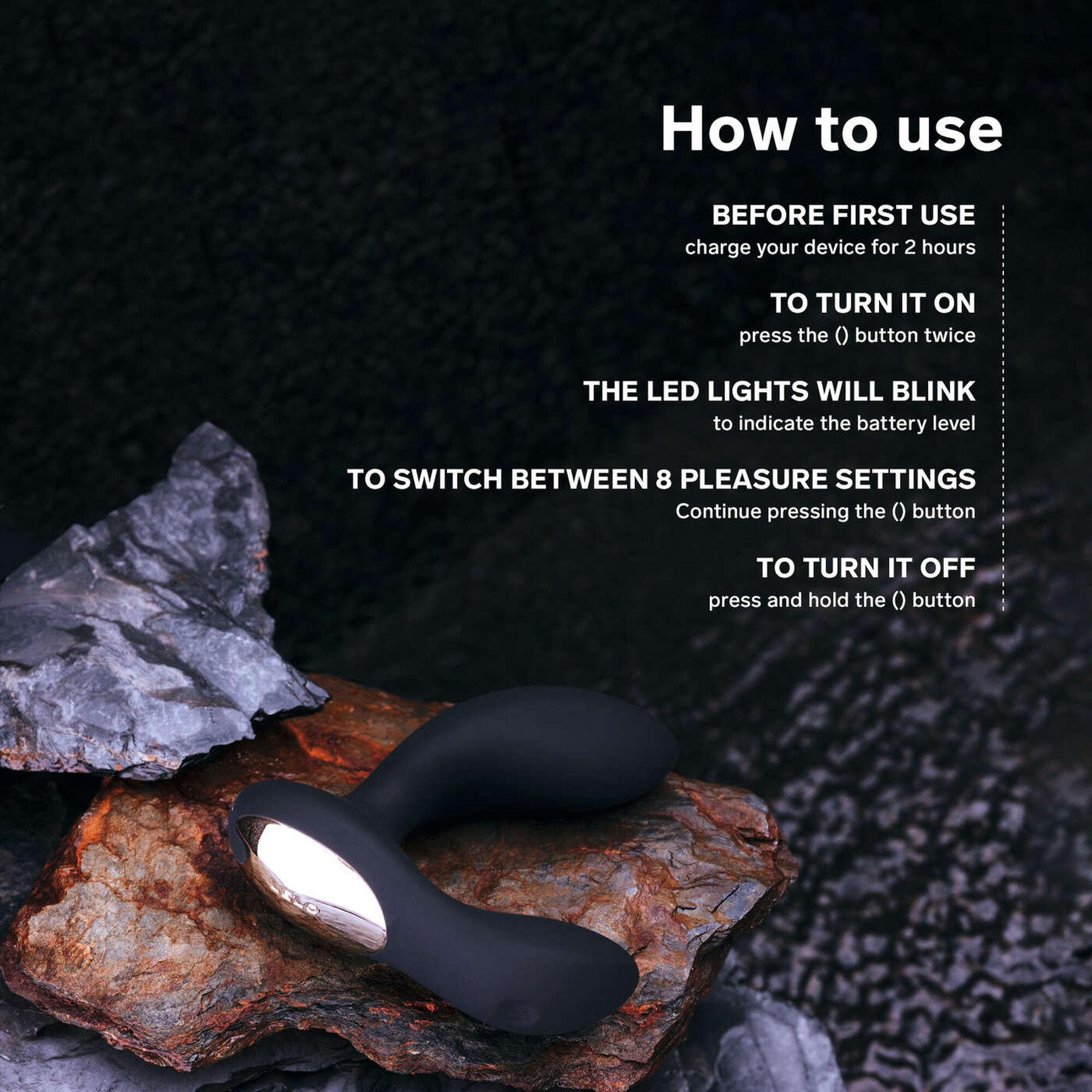 Aplica uma quantidade generosa de Hidratante Pessoal LELO no BRUNO™ e fica confortável. Introduz o BRUNO™, respirando profundamente até te sentires confortável. Liga-o. Alterna entre diferentes definições até encontrares a intensidade perfeita e desfruta de um clímax mais longo e poderoso.